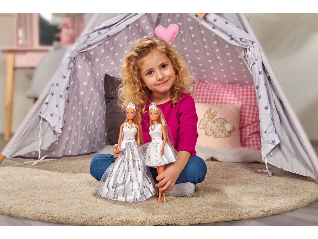 Panenka Steffi v nádherných třpytivých šatech s náhrdelníkem, páskem a tiárou zdobenými Swarovski crystaly. Výška panenky 29 cm.