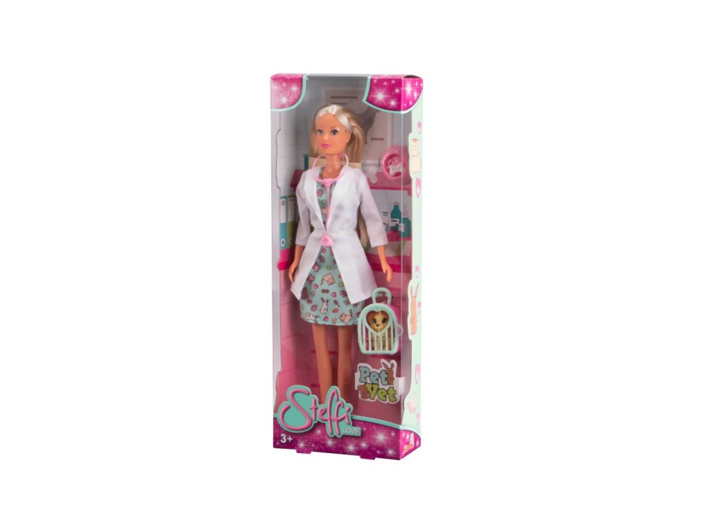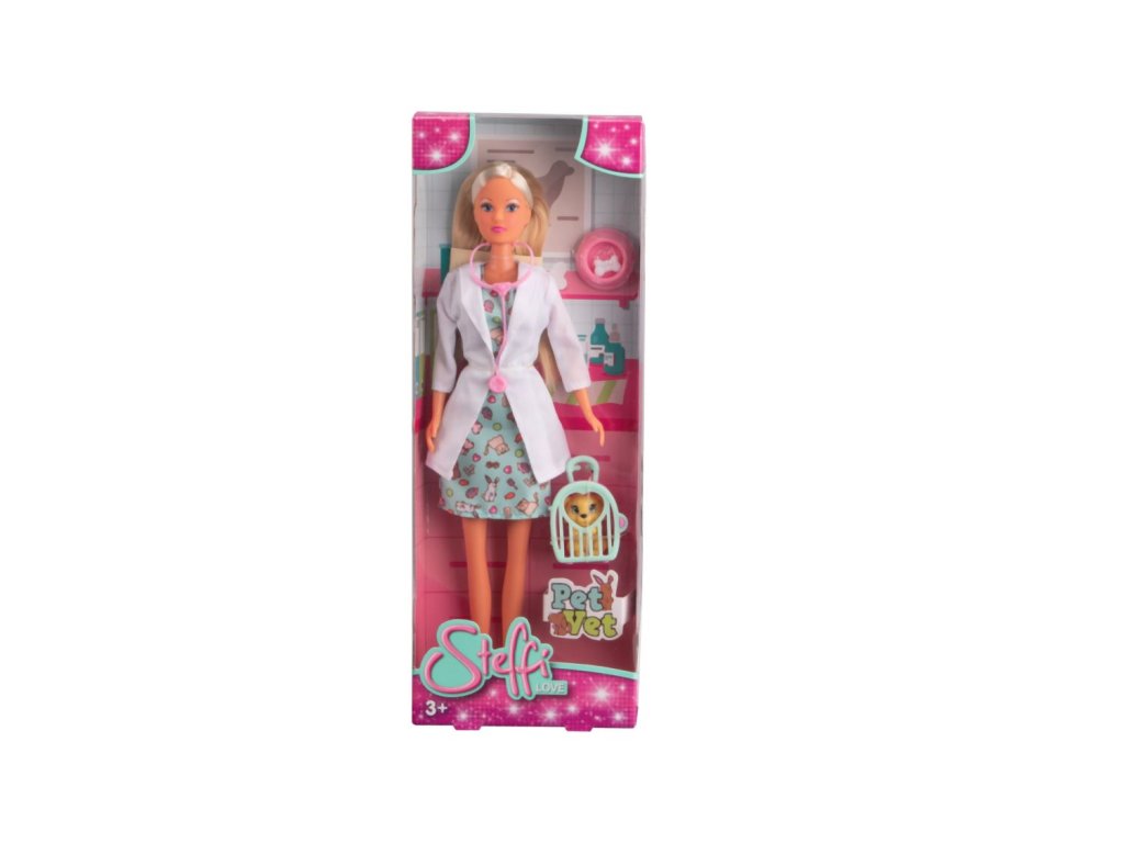 Panenka Steffi jako veterinářka se stará o pejska. Součástí balení je přepravka, miska pro psa a kostička. Velikost panenky 29 cm.