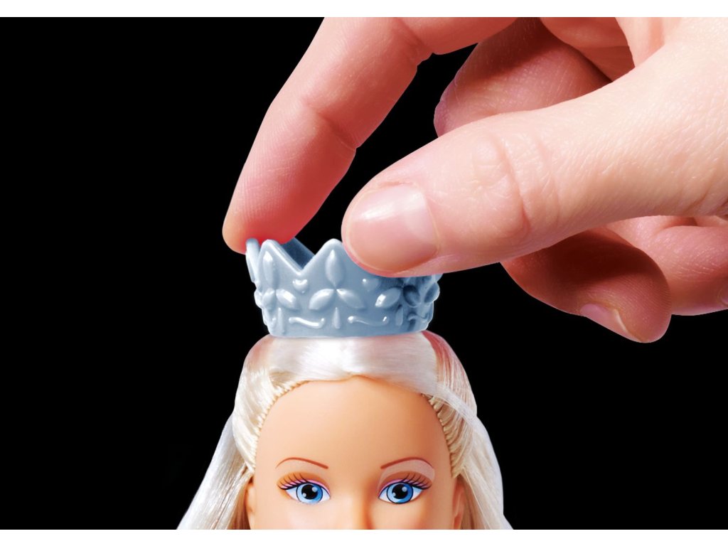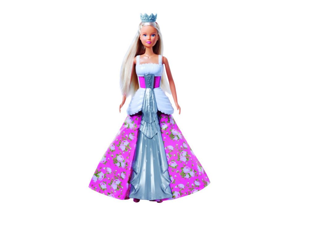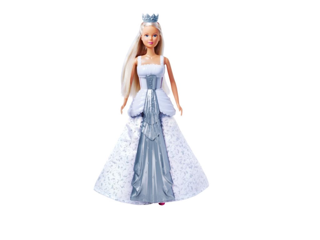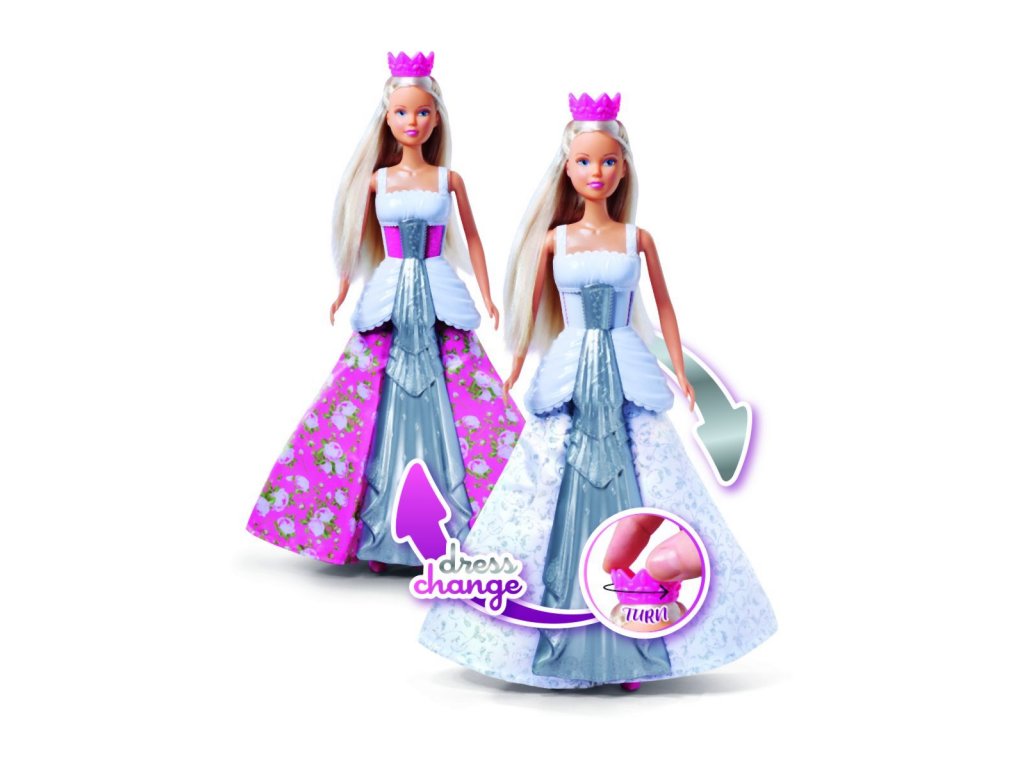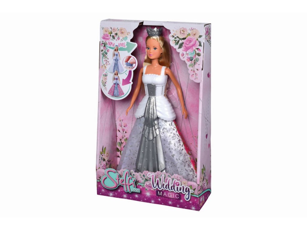 Panenka Steffi ve svatebních šatech. Otočením korunky na hlavě změníš šaty z bílých na růžové a naopak. Výška panenky 29 cm.