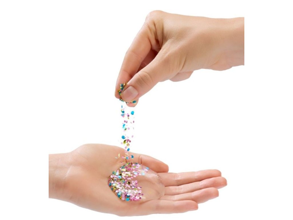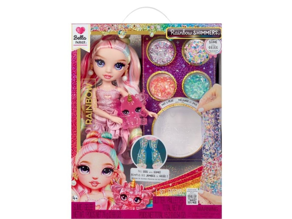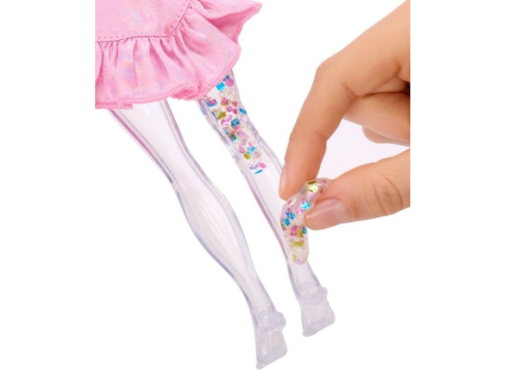 Rainbow High panenky jsou ještě kouzelnější! Společně se svými malými sestřičkami objevují nový svět, nové outfity a zcela nový způsob hraní. Každá panenka přichází s průhledným slizem a čtyřmi druhy třpytek. Třpytky přidej do slizu a uprav ho podle své fantazie. Poté sliz dej do průhledných nohou panenky a sleduj, jak se její nohy promění! Je to tak snadné! Sundej zadní část nohou, přidej sliz, zacvakni nohy zpět a můžeš si hned hrát! A to nejlepší? Můžeš to dělat znovu a znovu. Nebo můžeš třpytky a sliz kombinovat mezi různými panenkami.