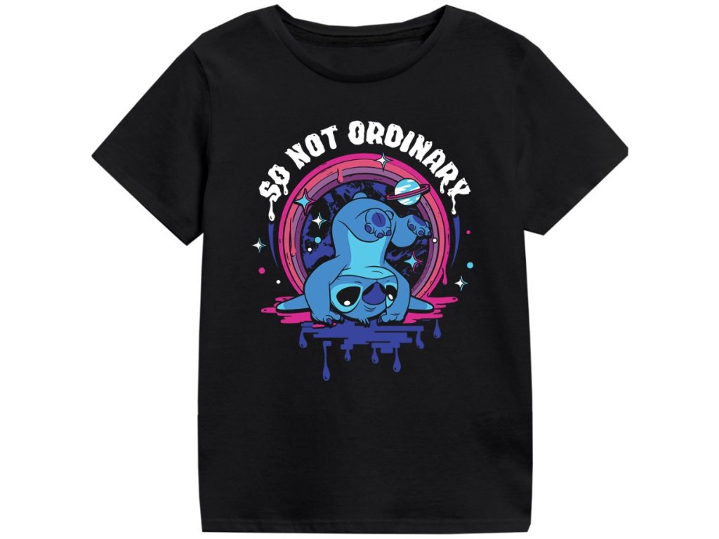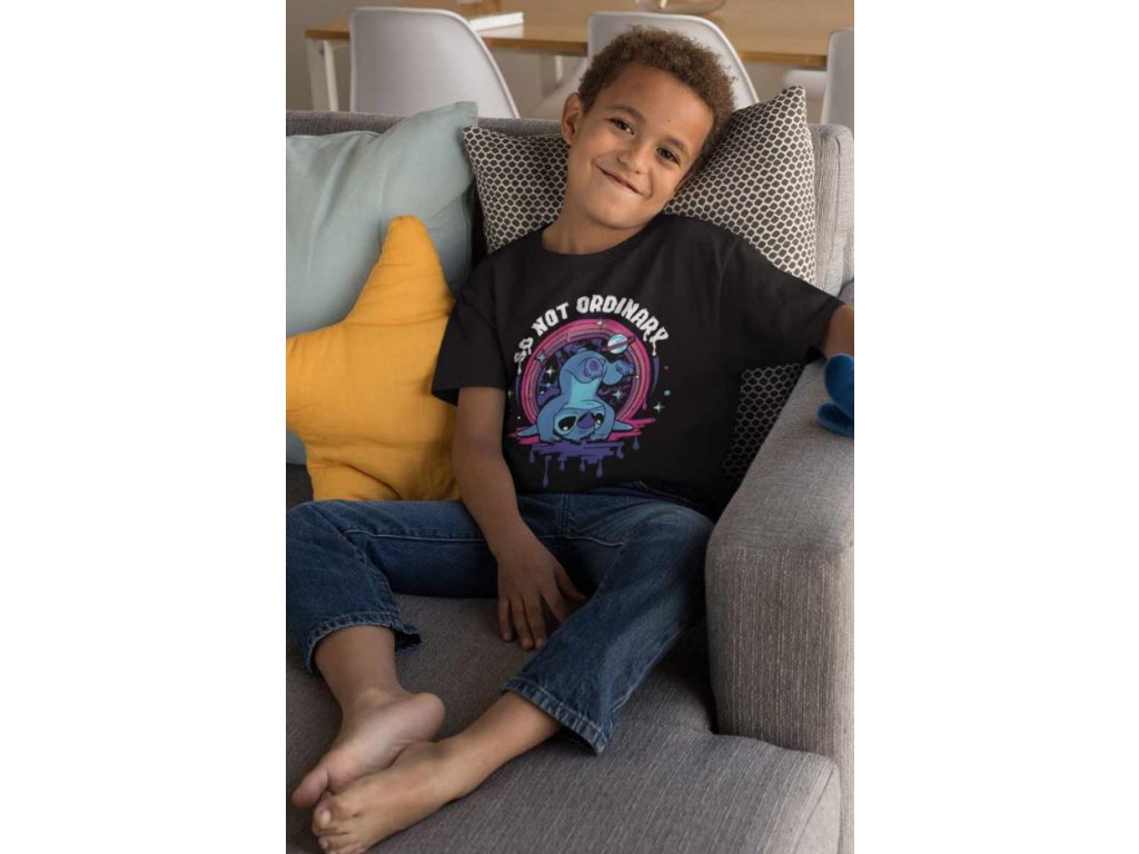 Černé dětské tričko s krátkým rukávem s grafikou Stitche a nápisem: "So not ordinary". Tričko je vhodným doplňkem pro všechny fanoušky pohádky Lilo and Stitch od společnosti Disney.