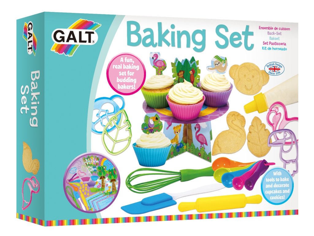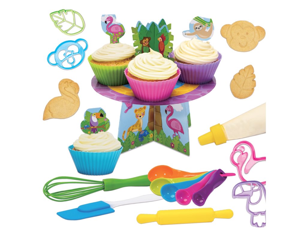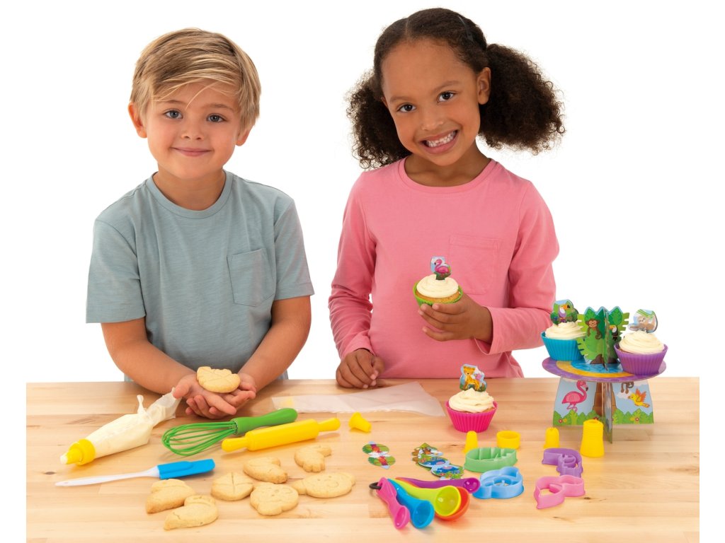 Zábavná sada pro opravdové pečení obsahující náčiní v zářivých barvách. Můžeš péct dortíky a sušenky, zdobit je pomocí zdobicí sady na polevu a vystavit je na podnosu. Sada obsahuje čtyři karty s jednoduchými recepty na vanilkové a čokoládové dortíky, sušenky a vanilkovou polevu.