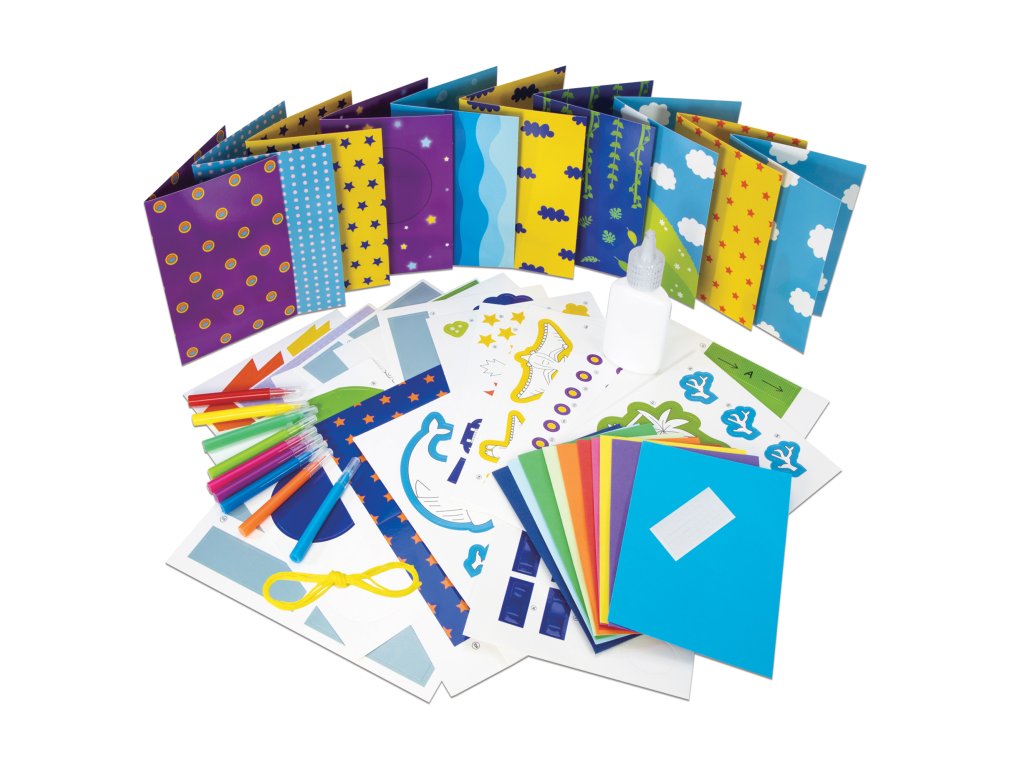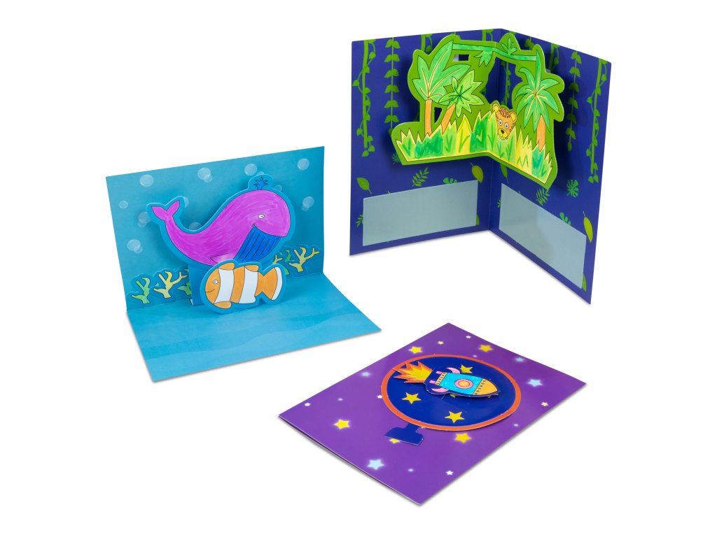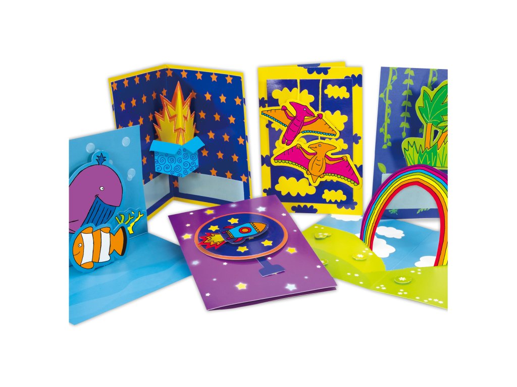 Sady obsahují 10 předem vykrojených kartiček a barevné fixy, které dětem umožní vytvořit 10 unikátních a kreativních pop-up pohyblivých kartiček.