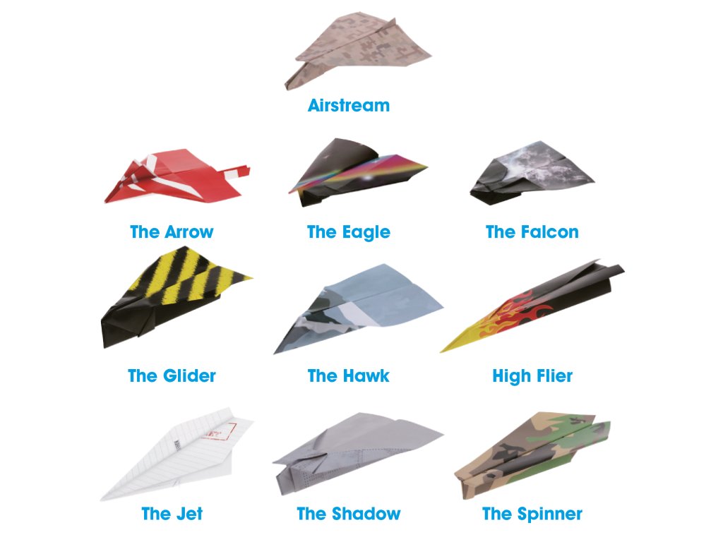 S tímto setem mohou děti vyrobit 10 různých papírových letadel podle návodu, který je součástí sady.