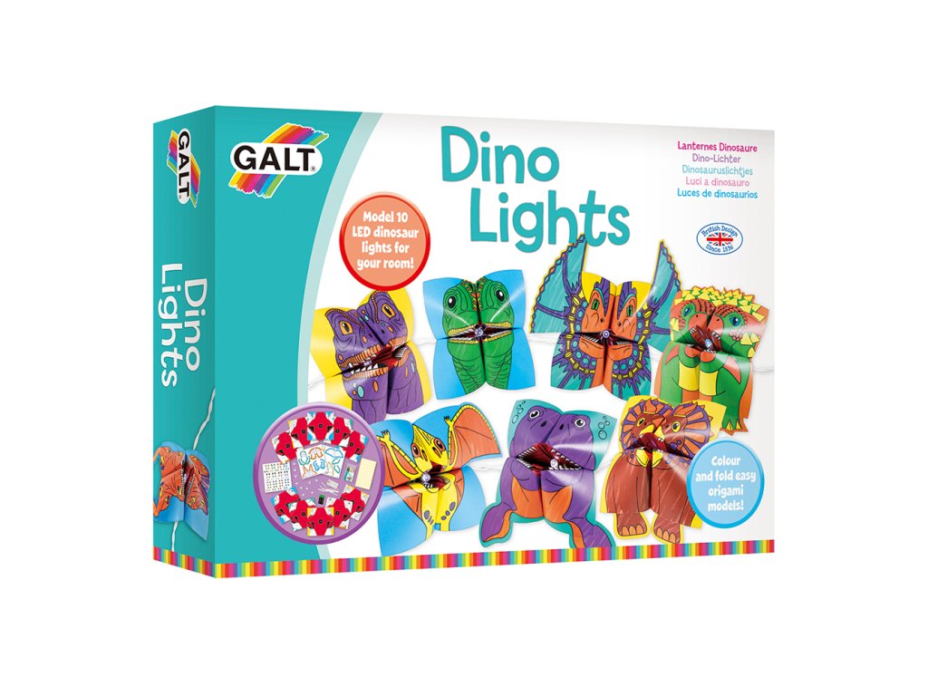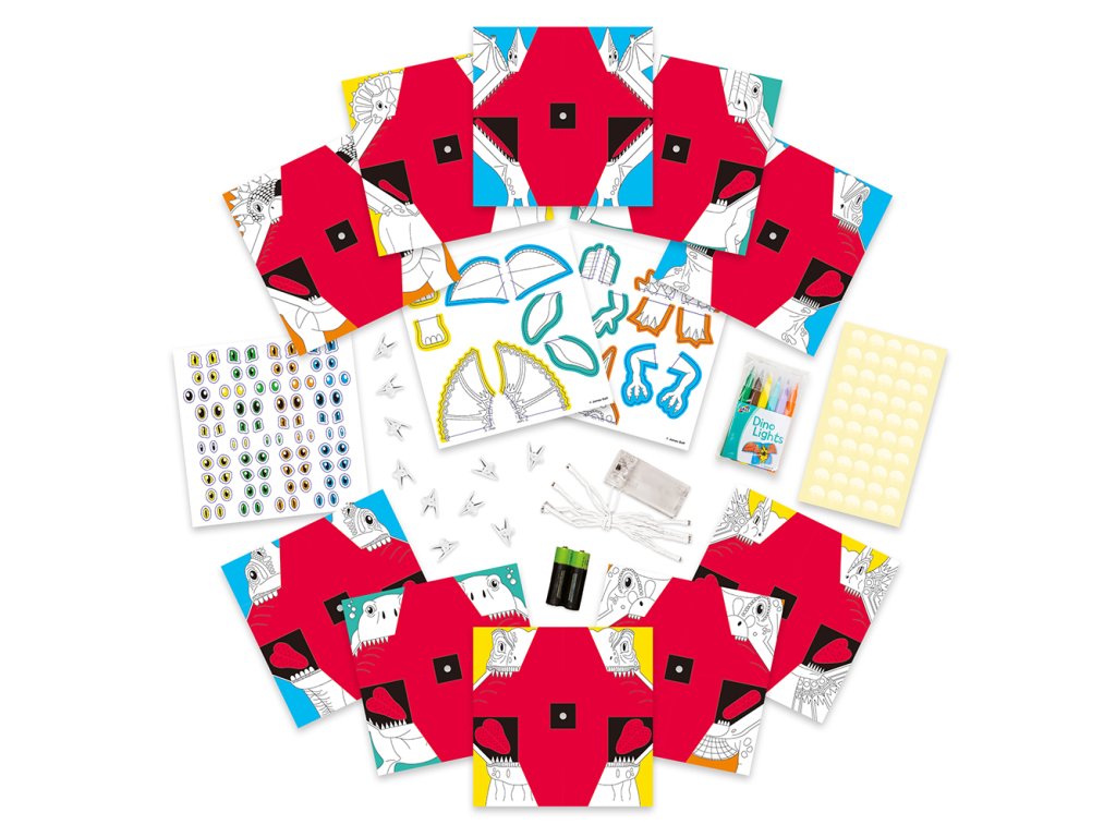 Obsah: 10 listů papírů s origami, 2 listy - částí těla dinosaurů, šňůra 10 LED světel s baterií, 2x AA baterie, 10 spon, 6 mini vláknových per, samolepka, lepící kruhy a průvodce