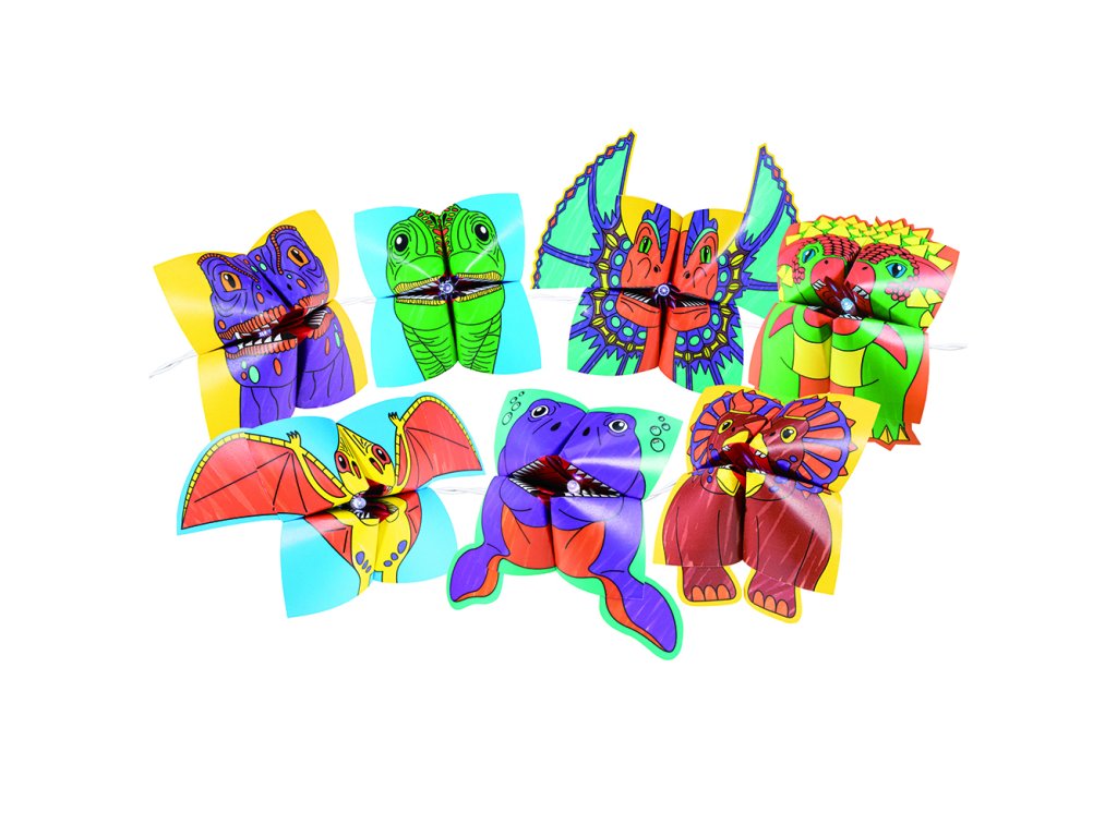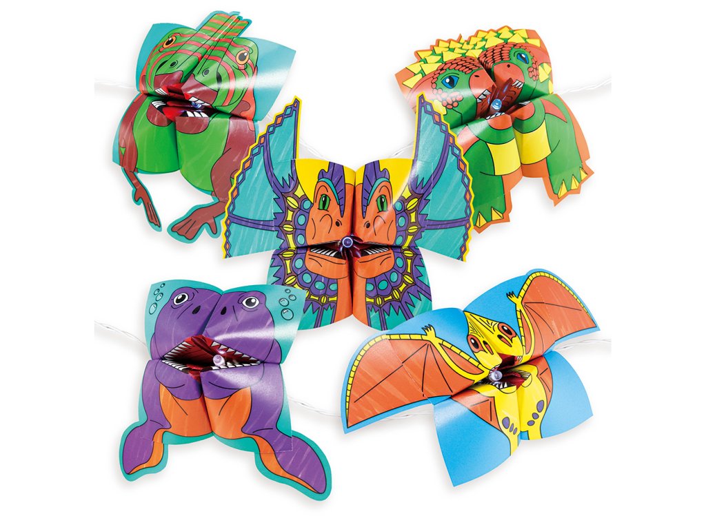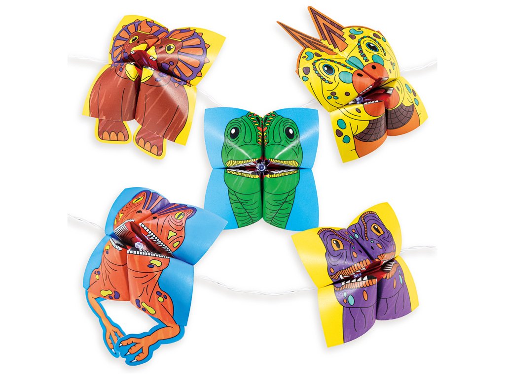 Řetěž rozjasní pokoj každého fanouška dinosaurů! Vybarvěte listy papíru z dinosauřích origami a podle pokynů krok za krokem je poskládejte. Poté přidejte samolepky, části těla a pomocí sponek je připevněte ke světlům pro prehistorickou světelnou show!