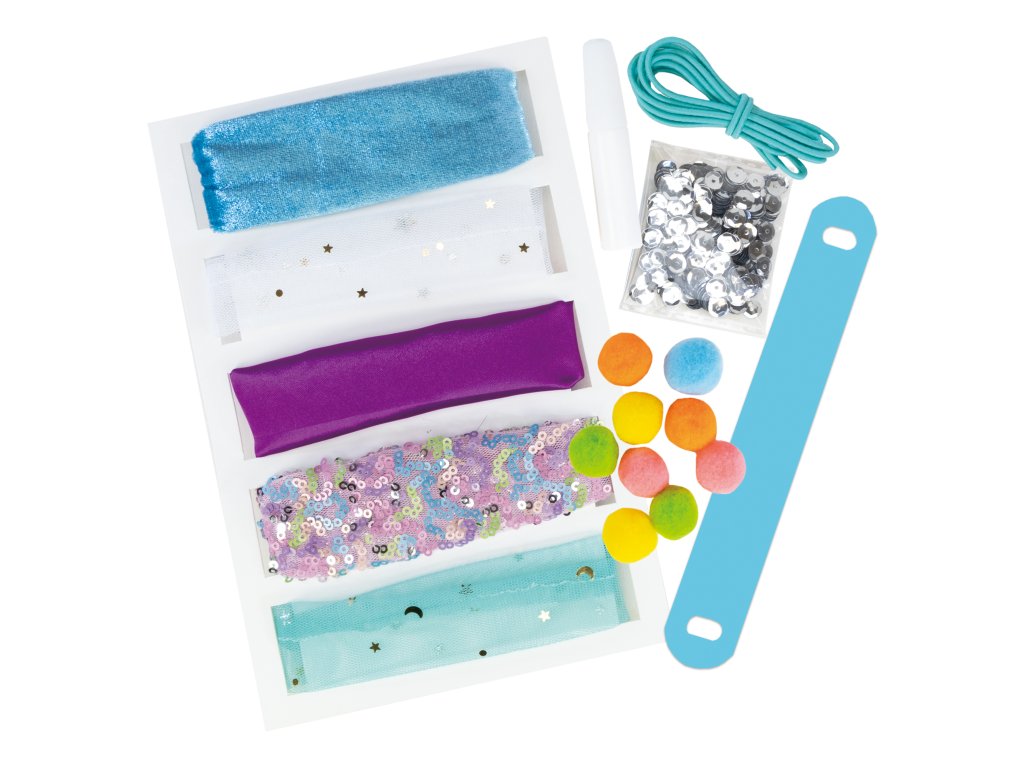 Obsah balení: nástroj na výrobu scrunchie, 5 látkových hadiček, bambulky, stříbrné flitry, bílé lepidlo, 1,5m elastická šňůra a anglický návod.