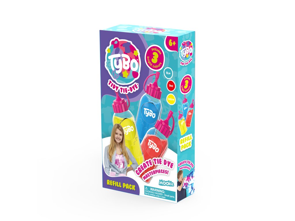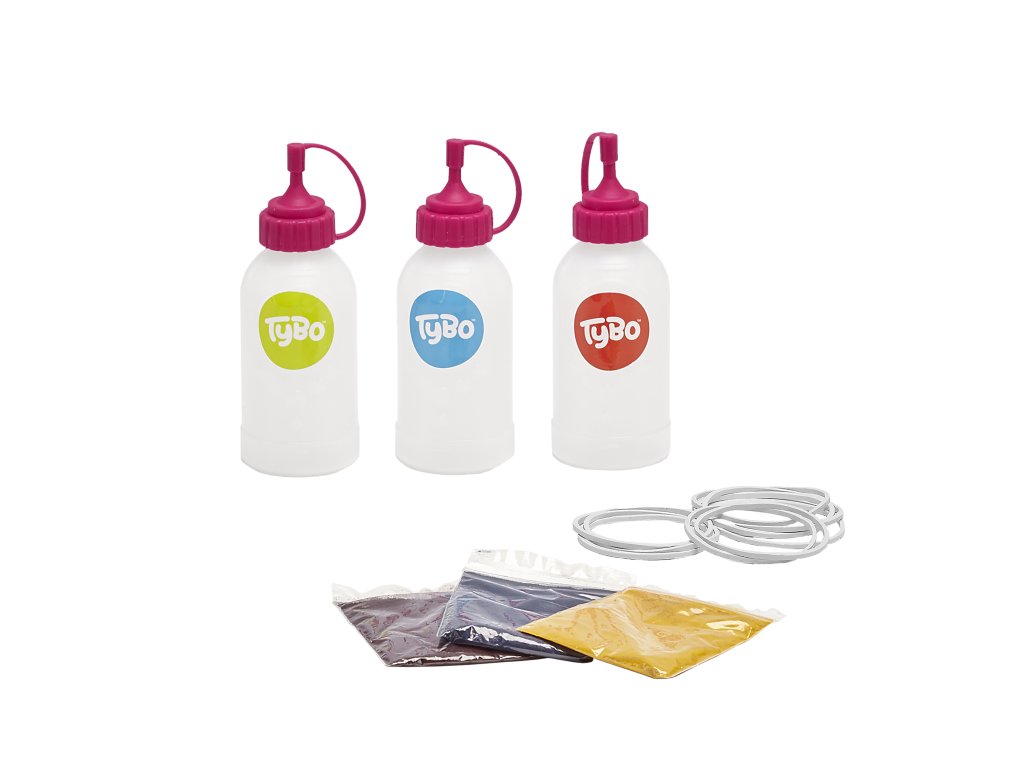 Tato sada obsahuje 3 pestrobarevné prášky, nádoby a elastické provázky na batikování!