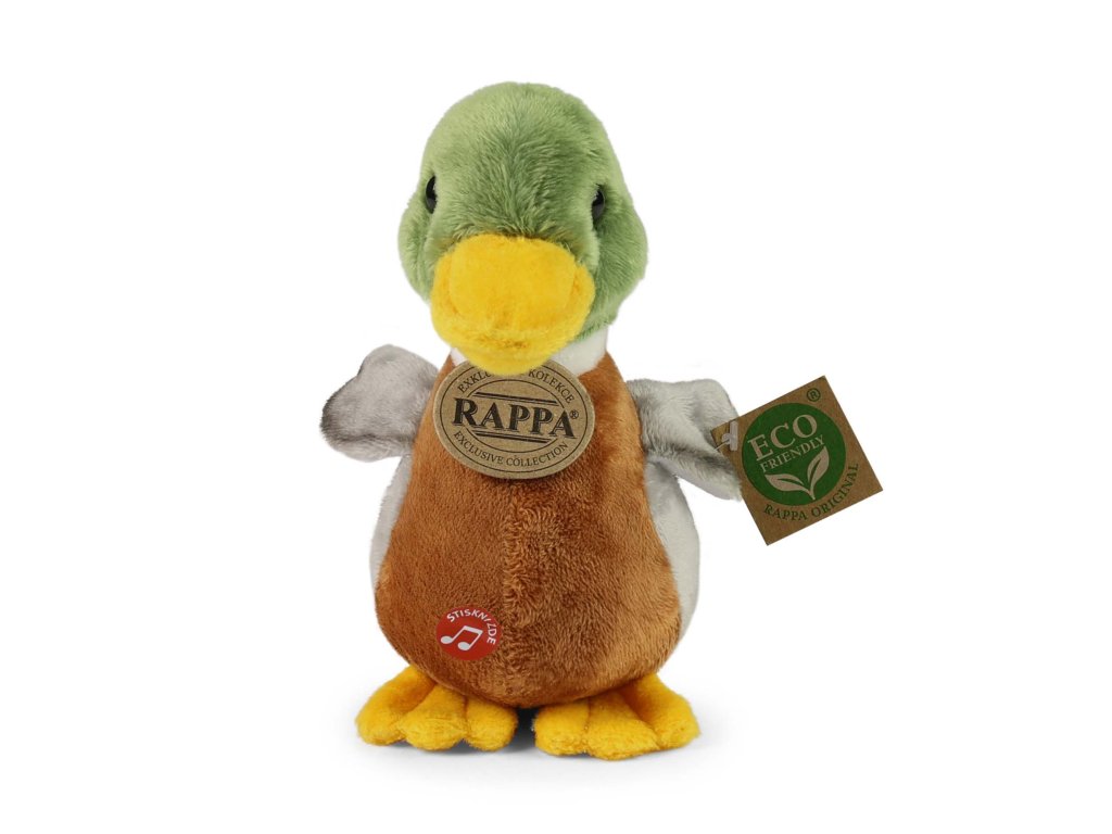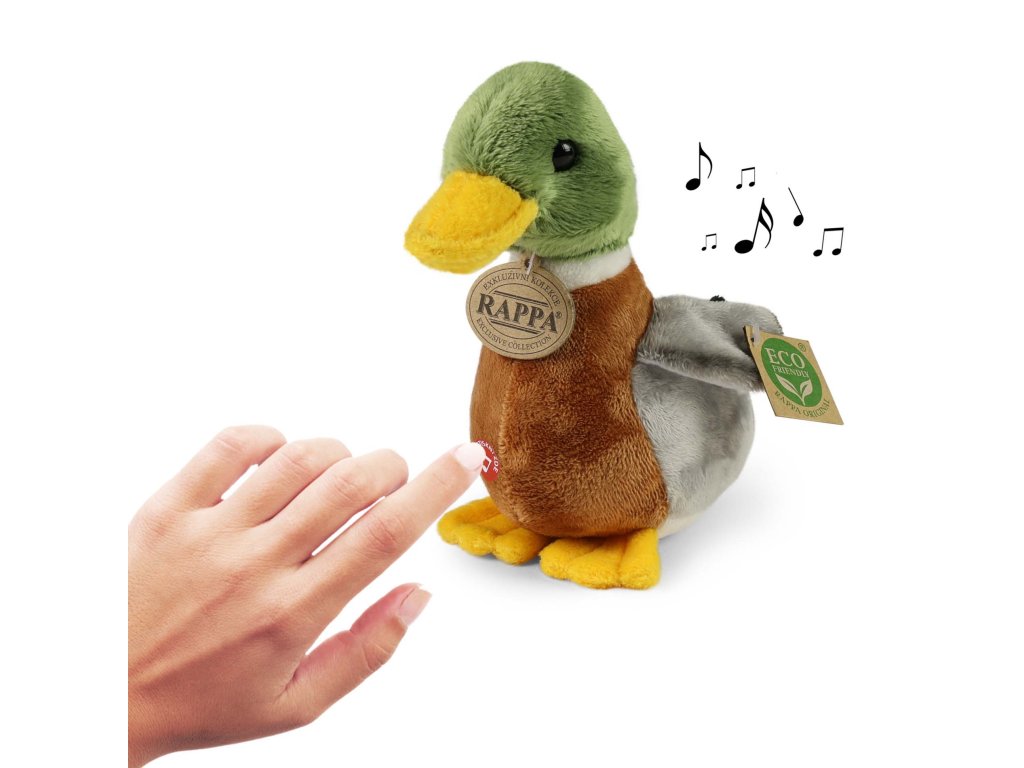 Plyšová kachna divoká měří 22 cm a díky těm nejkvalitnějším materiálům se řadí do Exkluzivní kolekce plyšových hraček značky Rappa. Díky ručnímu zpracování každého kusu navíc vypadá jako živá. Po stisknutí jejího bříška začne vydávat reálné zvuky. Proč označení ECO-FRIENDLY? Rappa si je vědoma všech dopadů na životního prostředí, zaměřuje se na udržitelnost a omezení používání plastů na minimum. Proto je výplň hraček vyrobena z recyklovaných materiálů, zejména PET lahví. Ta je však zcela nezávadná a vhodná i pro děti od narození. FUN FACT: Věděli jste, že divoké kachny mají voděodolné peří, díky speciálnímu oleji, kterým si peří potírají a tím zůstávají suché i při dlouhém plavání?