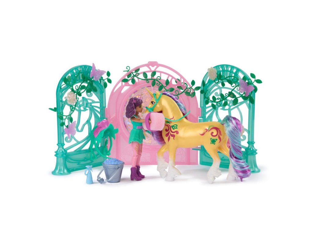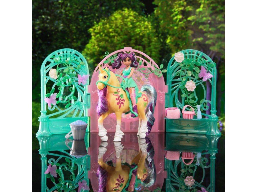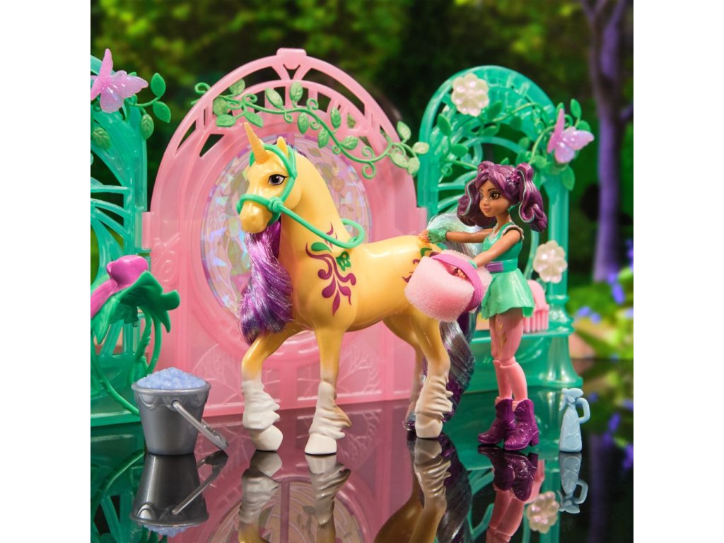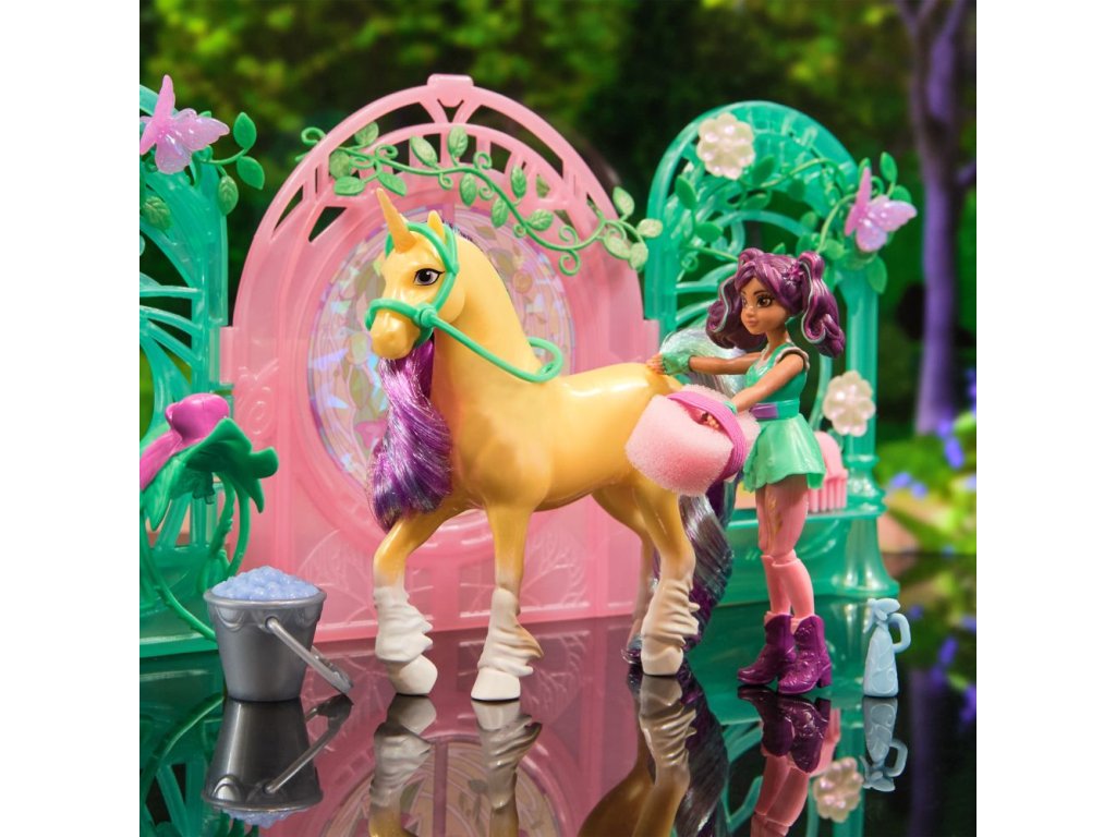 Malá stáj pro jednorožce 13 cm. Obsahuje fogurku Ava 11 cm a Leafe 13 cm. Pokud jednorožce umíváte přiloženou houbičkou, objevíte na jeho těle skryté ornamenty.