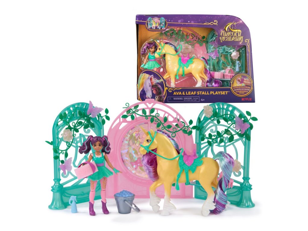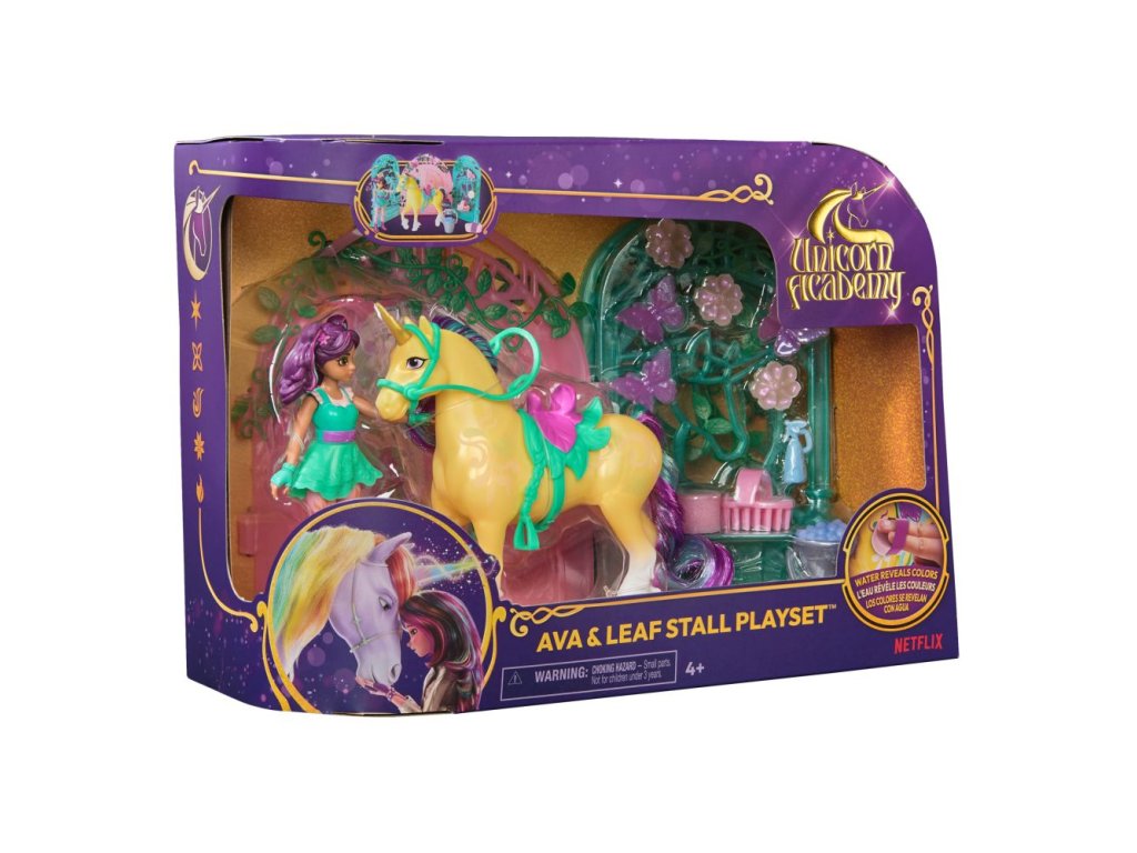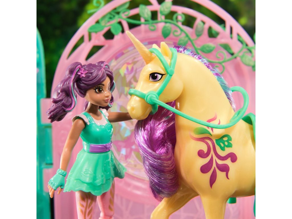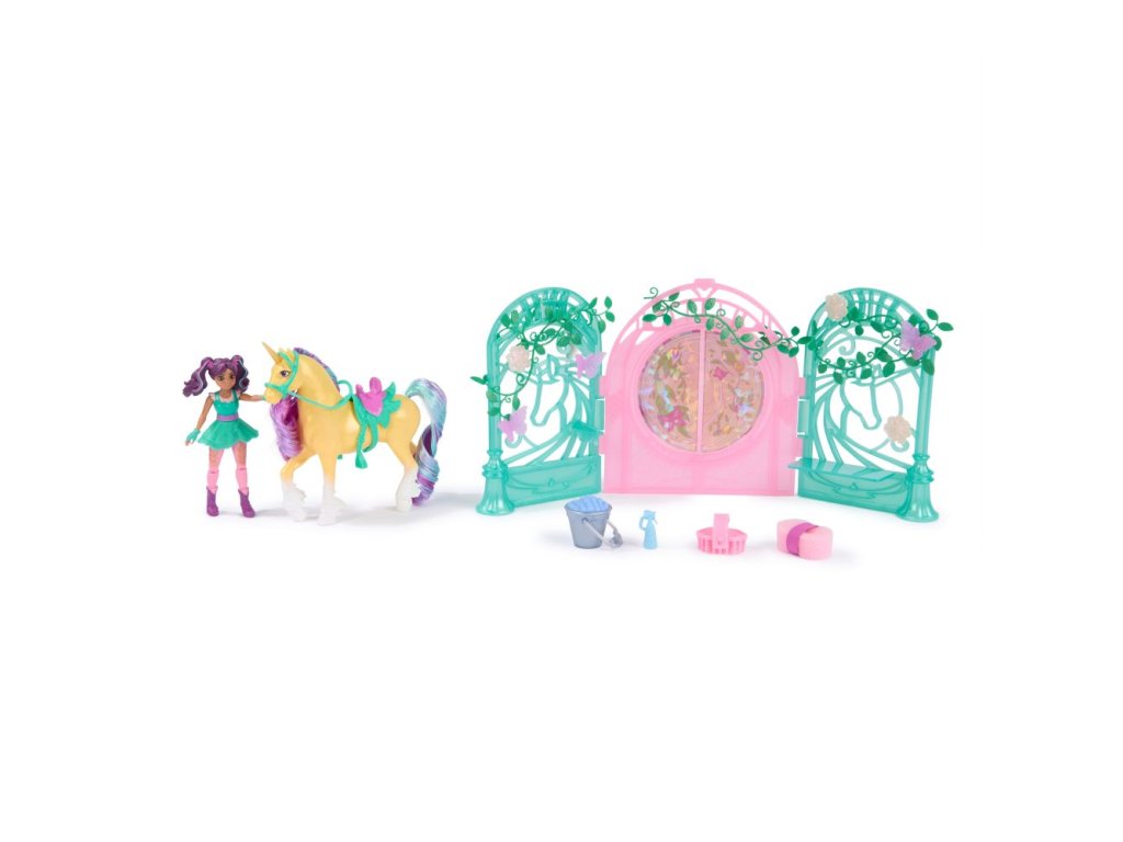 Malá stáj pro jednorožce 13 cm. Obsahuje fogurku Ava 11 cm a Leafe 13 cm. Pokud jednorožce umíváte přiloženou houbičkou, objevíte na jeho těle skryté ornamenty.