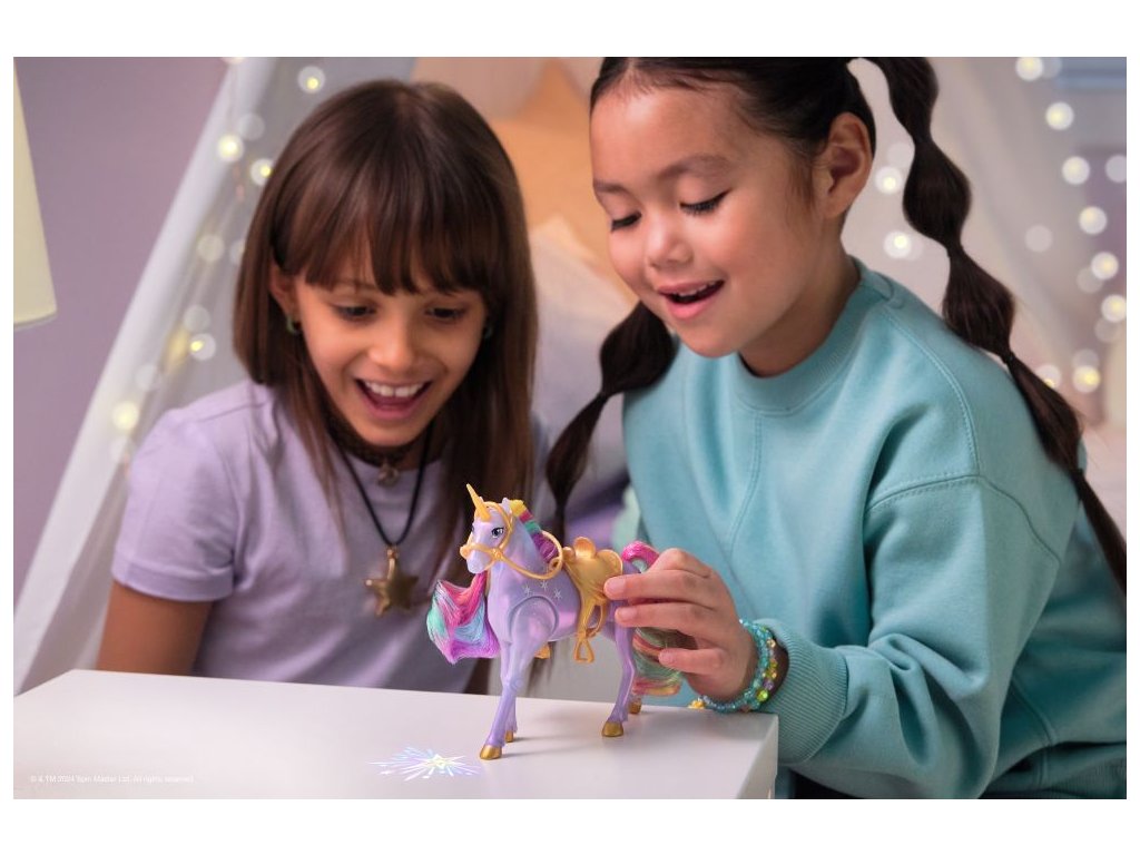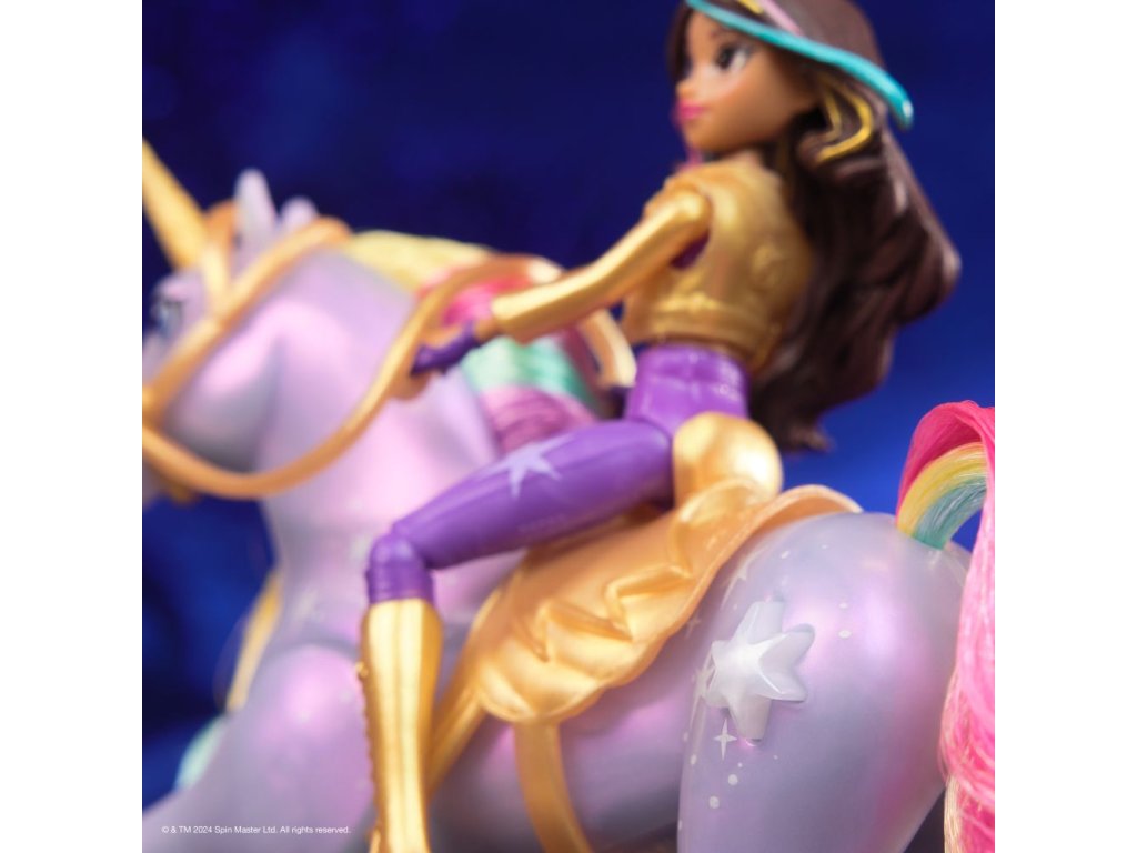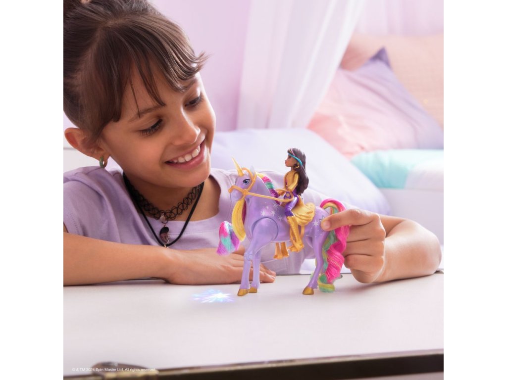 Zažijte kouzlo Jednorožčí akademie díky Sofii a Polárce se světelnou magií! Toto duo inspirované animovaným pořadem od NETFLIXu a bestsellerovou knižní sérií, kde přátelství drží otěže osudu, oslavuje jedinečné pouto mezi jezdcem a jednorožcem. Tato sada podněcuje kouzelnou kreativní hru díky Polárce, která se chlubí věrnými detaily, měkkou duhovou hřívou a ocasem a skutečnými světelnými efekty. Díky 7 kloubům lze Sofii posadit na Polárku a stisknutím tlačítka s hvězdičkou na Polárčině straně lze aktivovat světla a přehrát si své oblíbené scény z pořadu (součástí balení jsou 3 baterie LR44). Když Polárka dupne kopytem, vytvoří pomocí světelné magie duhový vzor, přesně jako v seriálu! Díky odnímatelné uzdě a sedlu zůstane Sofie bezpečně na hřbetu Polárky. Chcete-li objevit všechny způsoby, jak si užít svět Jednorožčí akademie se svými oblíbenými postavami, si prohlédněte další malé panenky, jako jsou Ava, Layla, Isabel a Valentina spolu s jejich jednorožci (sady se prodávají samostatně), rozšiřte svůj kouzelný svět! Určeno pro děti, které mají rády jednorožce a koně, panenky a doplňky, hračky pro panenky, sběratelské předměty, plyšové hračky a další. Hračky s tematikou Jednorožčí akademie jsou perfektním dárkem pro dívky k narozeninám nebo jakékoli jiné příležitosti. Prožijte vlastní zářivé dobrodružství z Jednorožčí akademie díky Sofii a Polárce se světelnou magií!