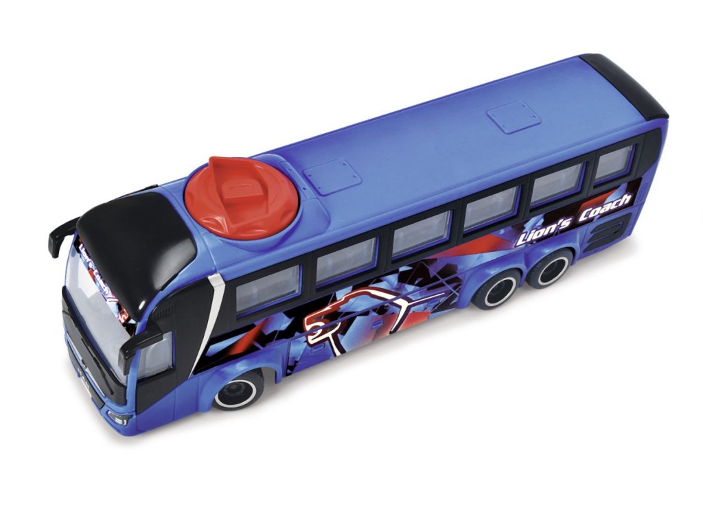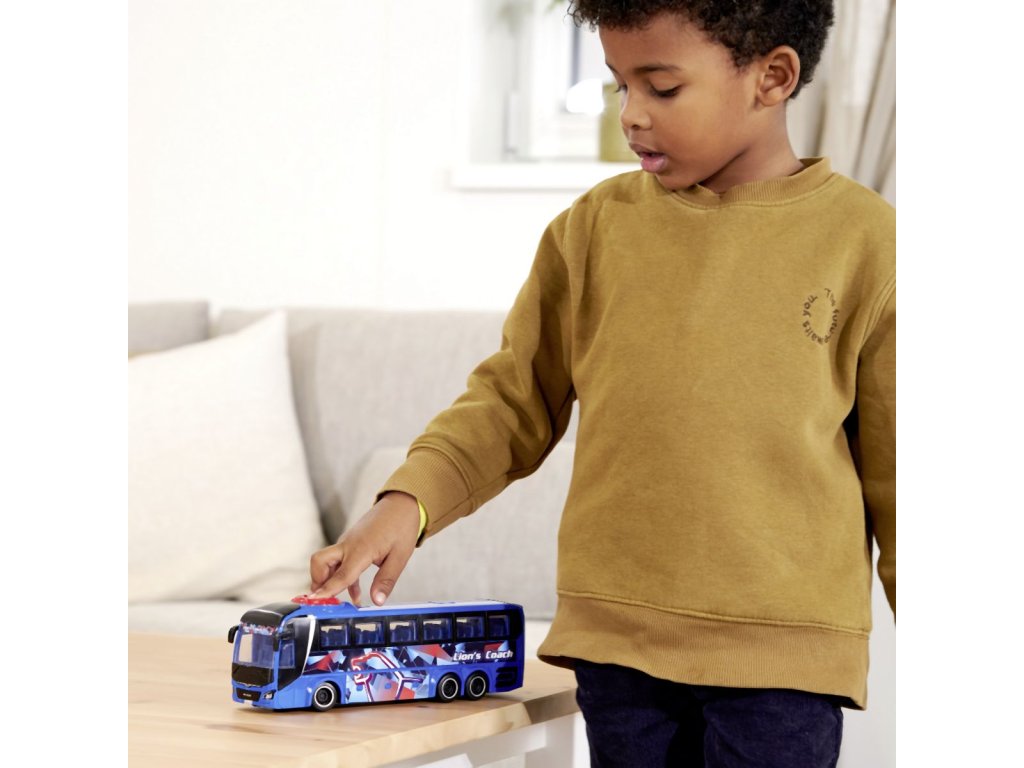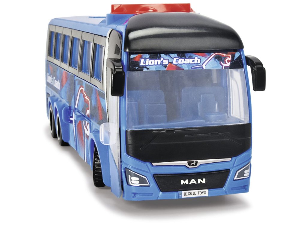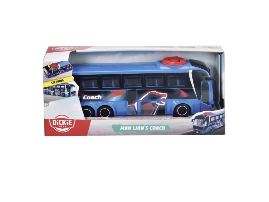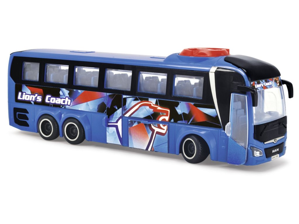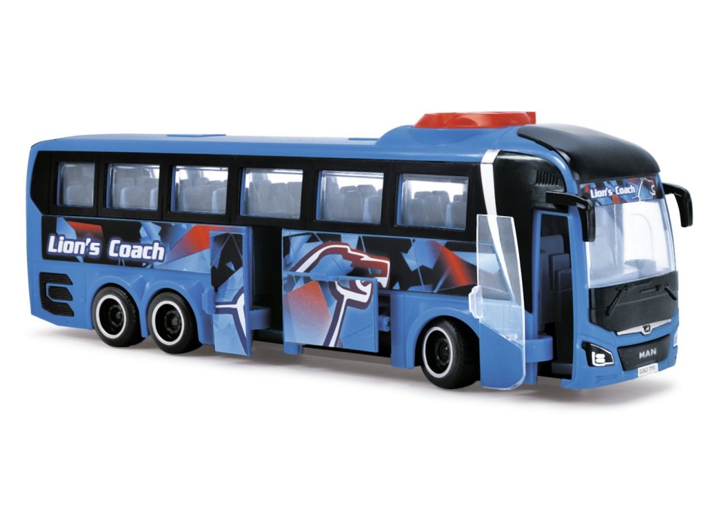 Autobus MAN Lion´s Coach na volnoběh, otáčením kolečka na střeše se ovládají přední kola, otevírací dveře a zavazadlový prostor. Barva modrá. Délka 26,5 cm.