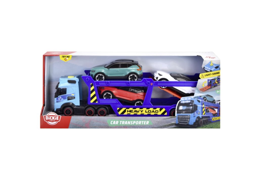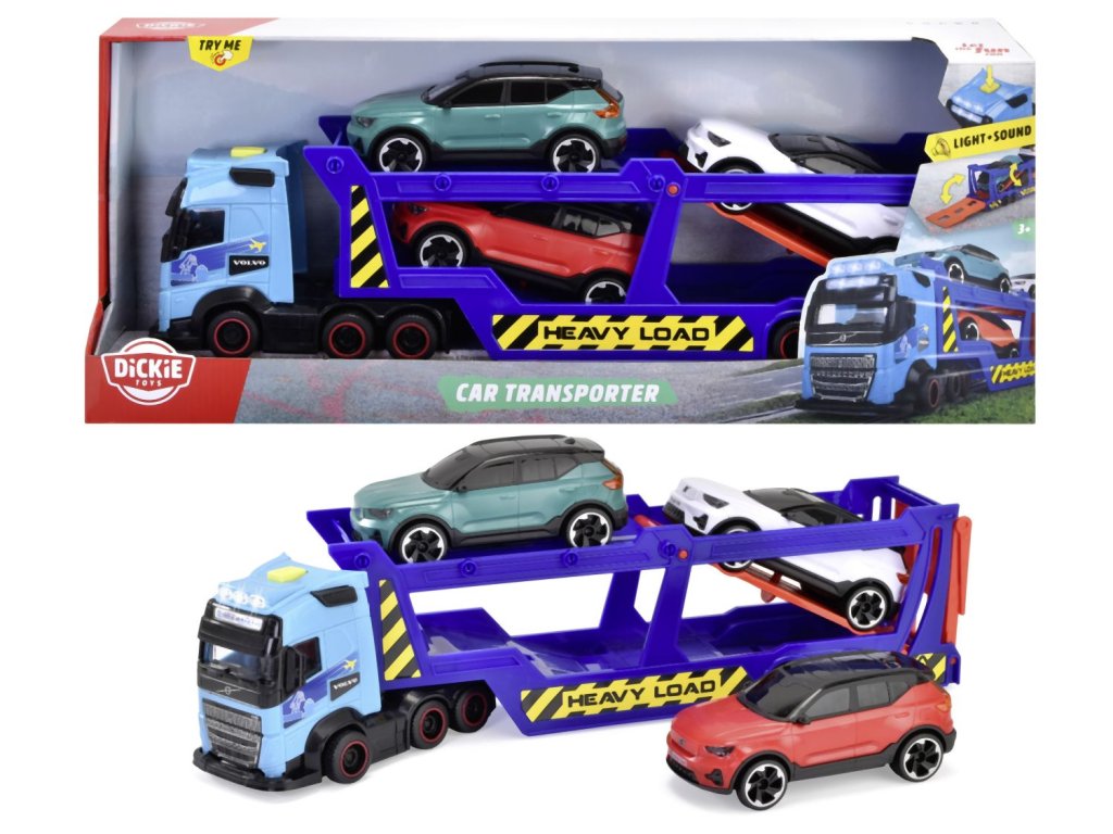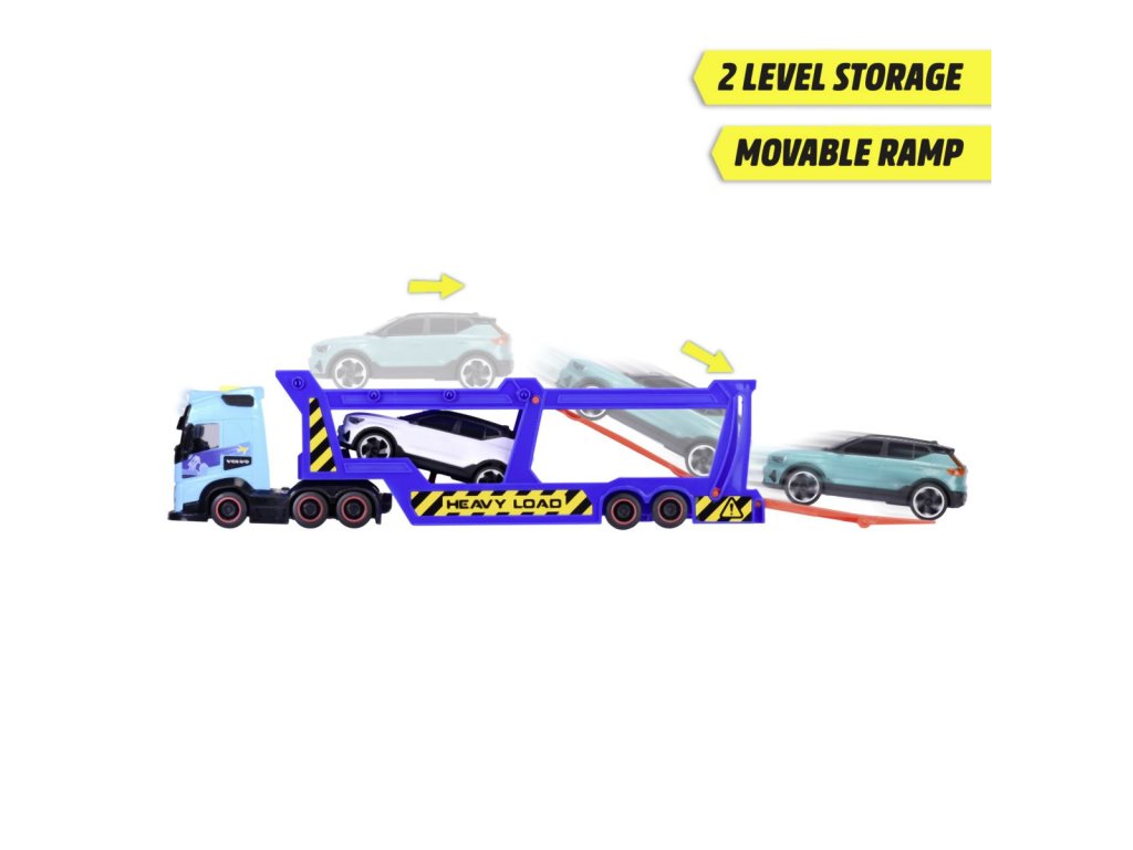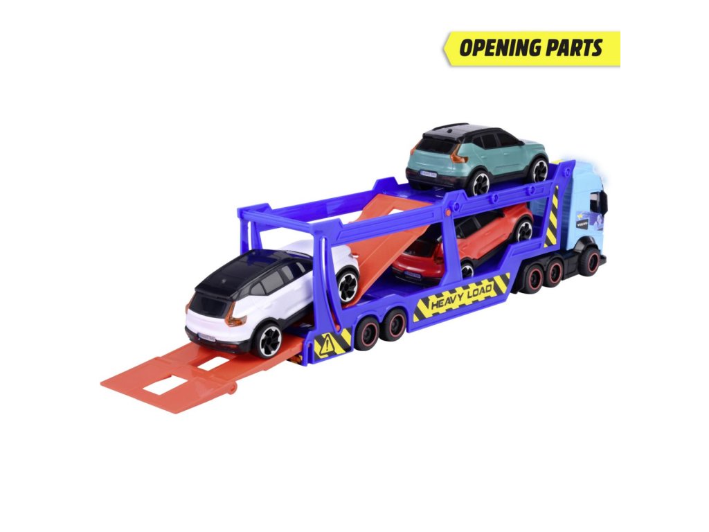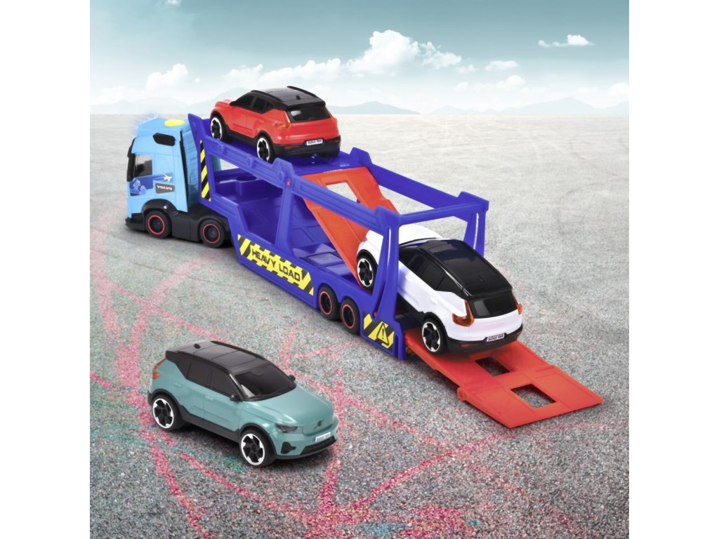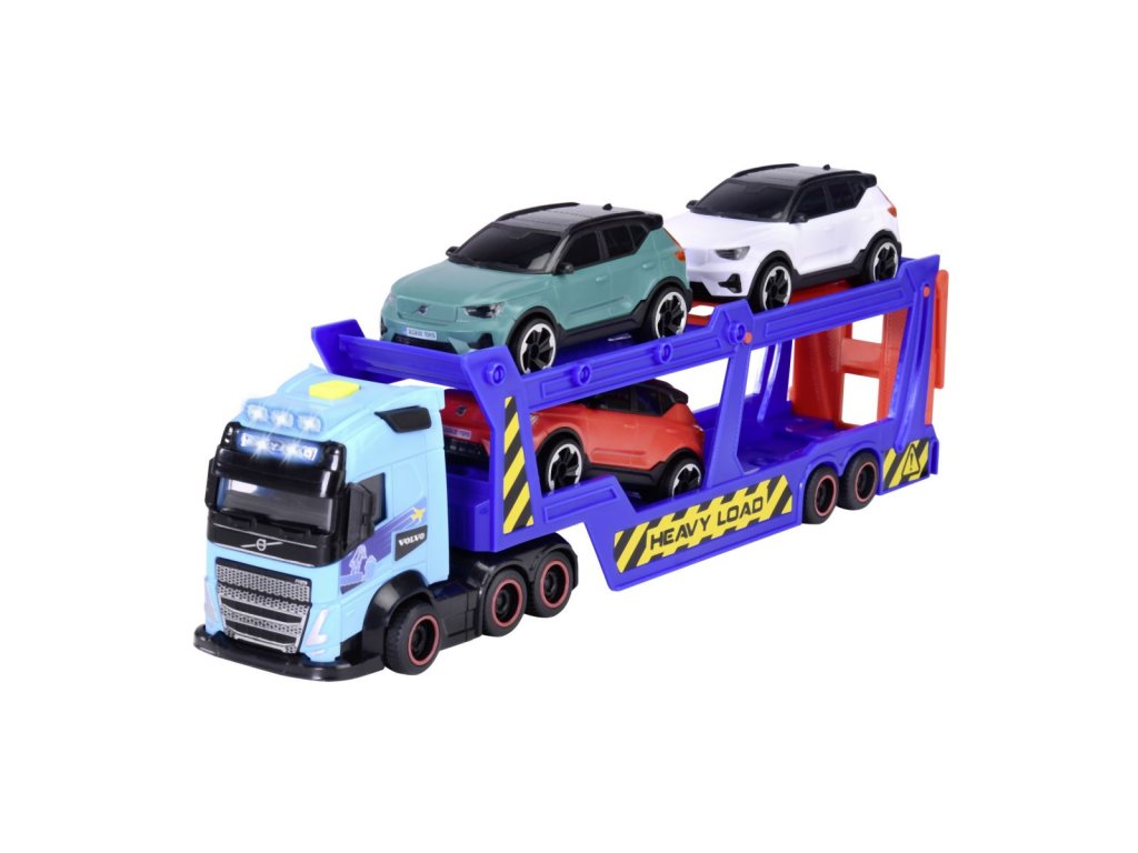 Autotransportér Volvo FH 16 na volnoběh. Funkce světel a zvuku, přívěs pro transport aut. Součástí jsou 3 auta na volnoběh - Volvo XC40 Recharge. Délka 40 cm.