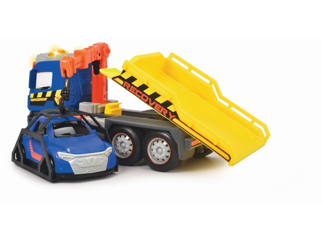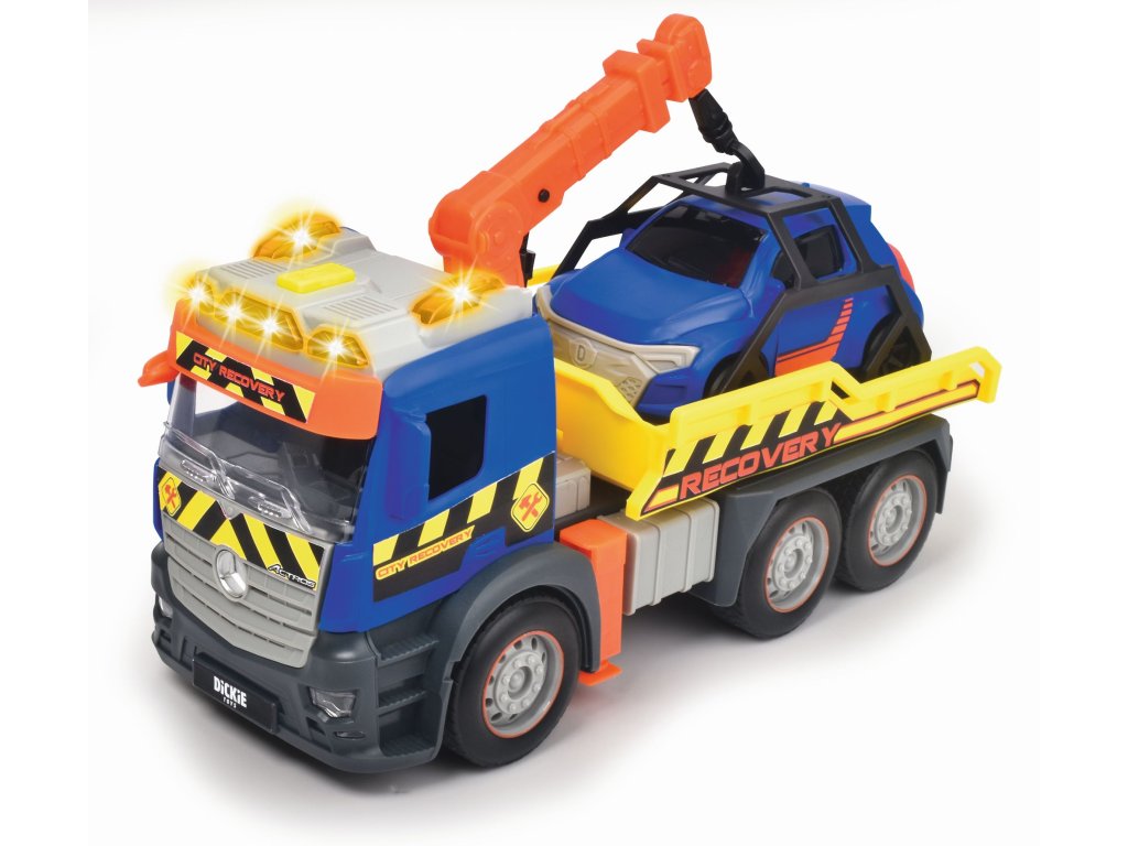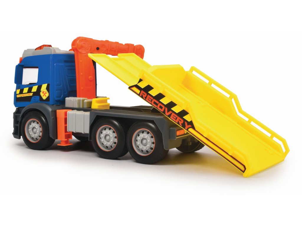 Odtahový vůz Mercedes na setrvačník se světelnými a zvukovými efekty a pohyblivými díly, délka 26 cm. Součástí osobní auto na volnoběh, 12 cm.