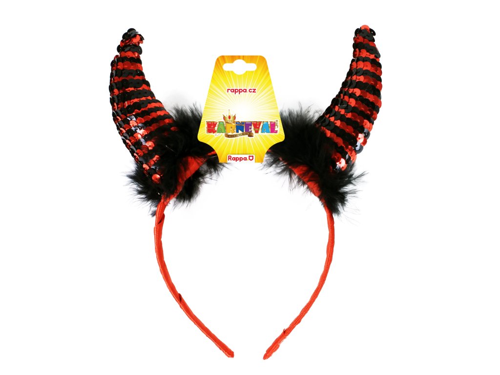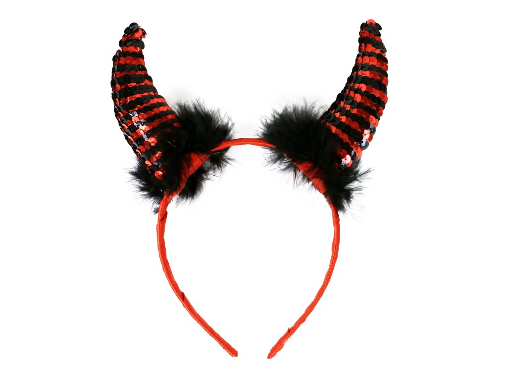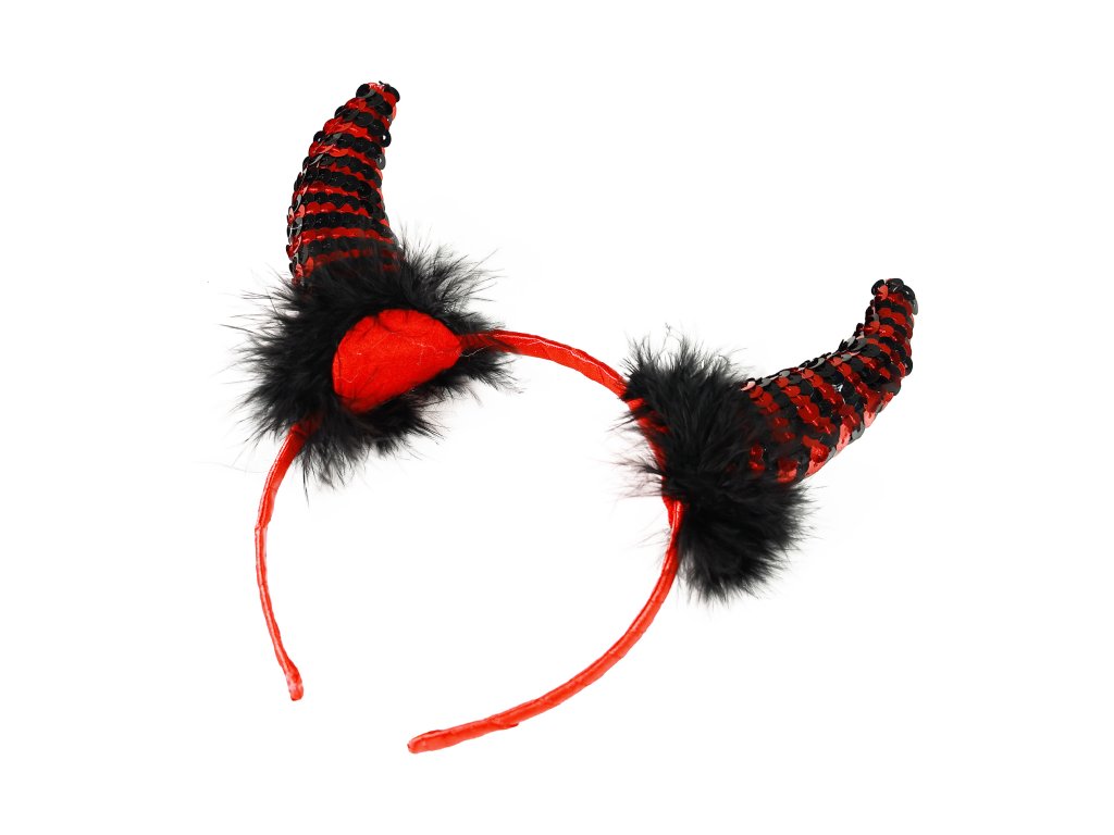 Úžasné čertí rohy na saténové čelence jsou zdobeny oslnivými flitry a hebkým peřím. Tyto senzační růžky se stanou ozdobou každé půvabné čertice!