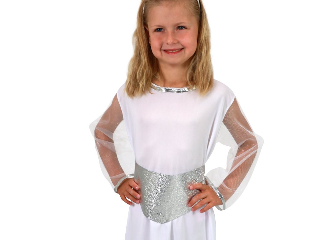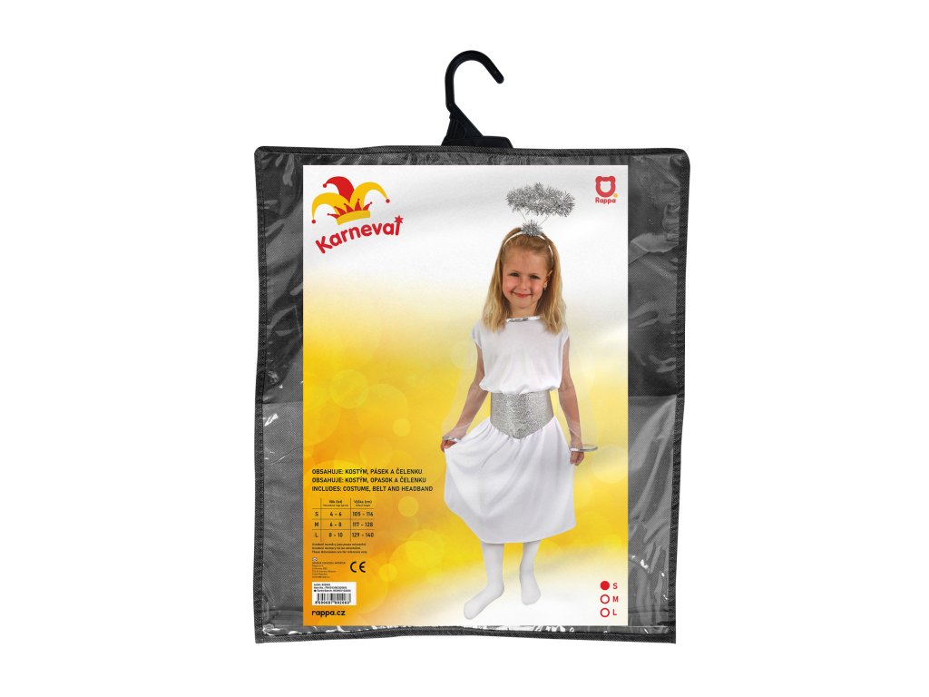 Půvabný karnevalový kostým s motivem anděla ve stříbrno-bílé barvě a velikosti S je určen pro holčičky ve věkovém rozmezí 4-6 let (110-116 cm). Balení obsahuje svatozář, pásek a šaty.