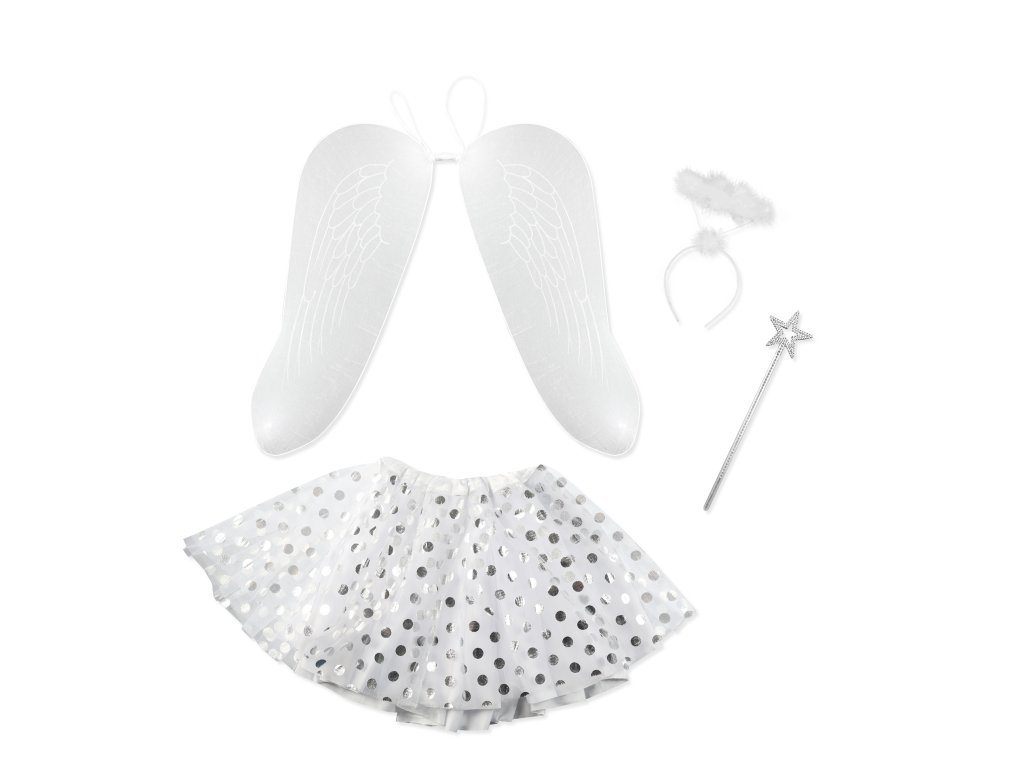 Roztomilá souprava pro všechny malé andílky! Kostýmek bílé barvy je určen pro holčičky ve věkovém rozmezí 3-7 let. Balení obsahuje nadýchanou sukničku zdobenou stříbrnými puntíky, perfektně sladěná křídla, čelenku s peřím a hůlku.