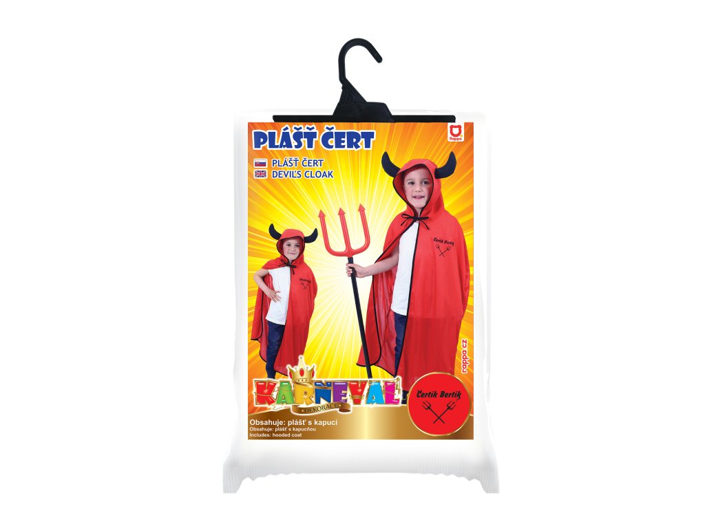 Karnevalový plášť čerta v červeno-černé barvě a v univerzální velikosti je určen pro děti ve věkovém rozmezí 3-10 let (104-146 cm). Balení obsahuje plášť s kapucí, na které jsou přišity rohy. Délka pláště je cca 104 cm.