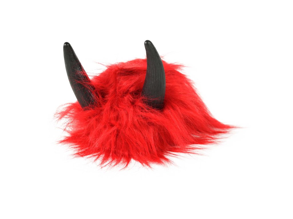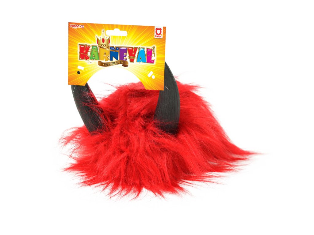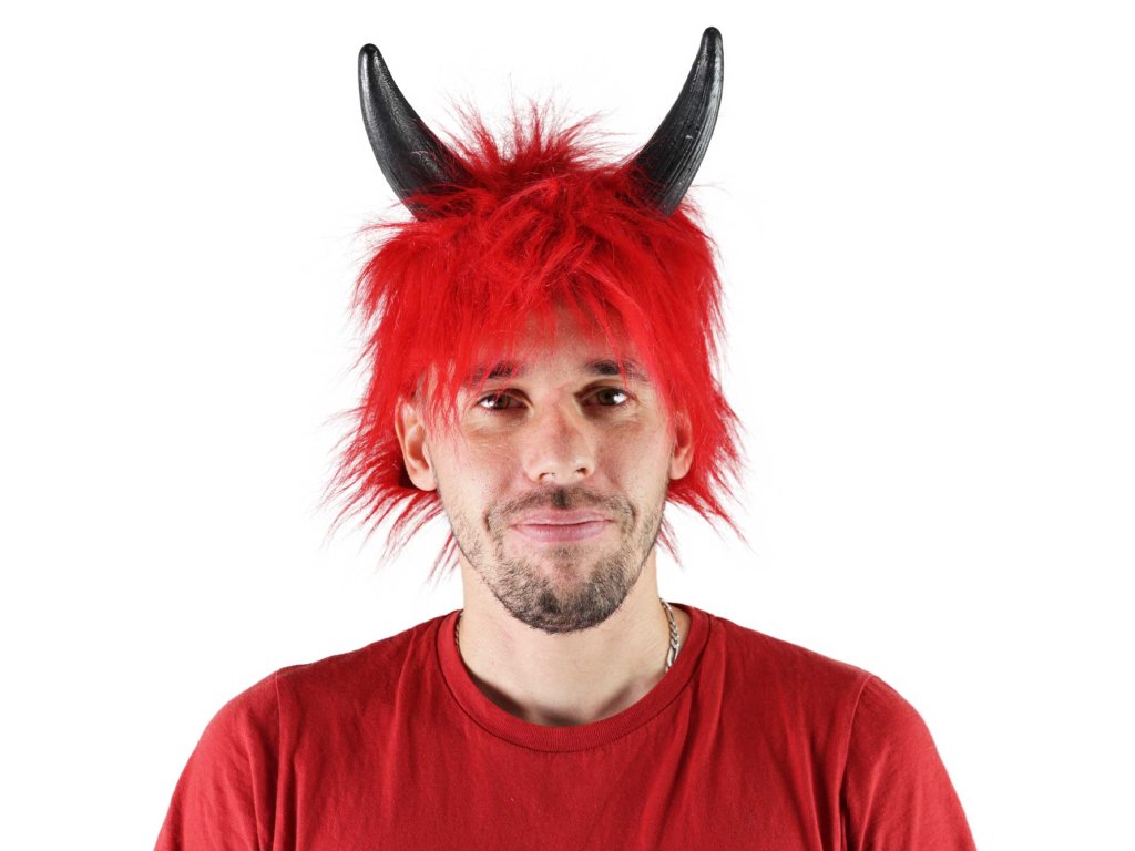 Karnevalová paruka v motivu ďábla. Paruka má krátké červené vlasy, krátkou ofinu a je dekorována rohy.