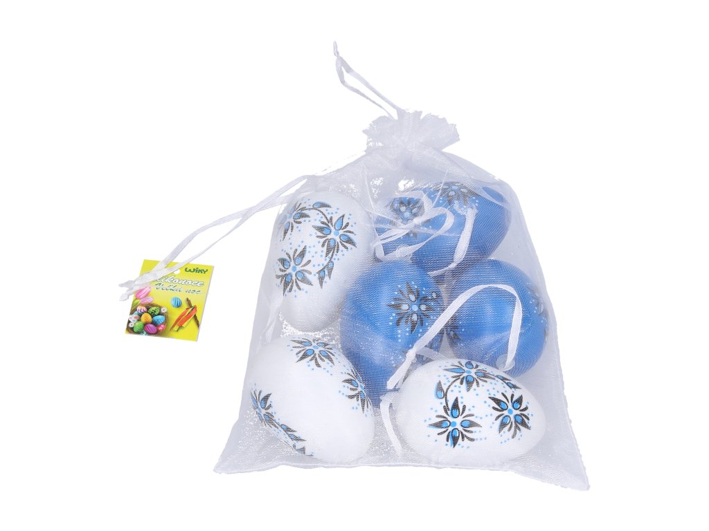 Vajíčko dekorační plastové bílé a modré o velikosti 4x6 cm.