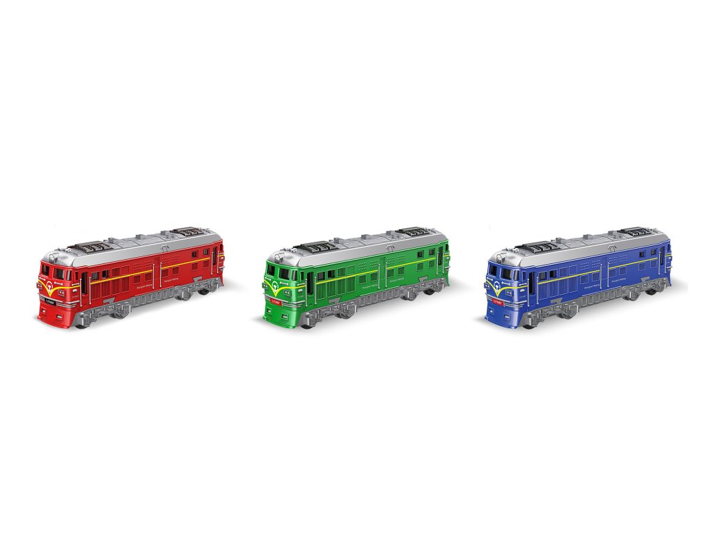Vlak na setrvačník. Rozměry 18x4x6 cm. Display box 8 ks. 3 varianty - červená, modrá, zelená.