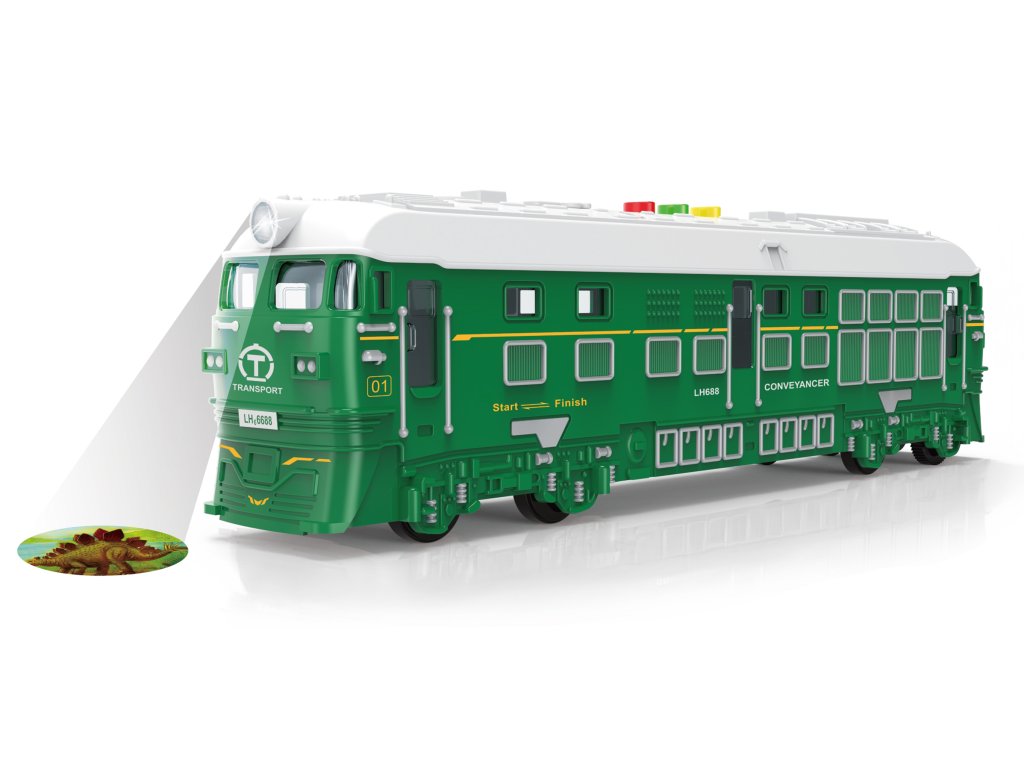 Vlak na setrvačník s efekty a projekcí zelený. Rozměry 33x8x6 cm. Vydává světelné a zvukové efekty, projekce. Aktivace tlačítky na střeše (zvuky vlaku a železnice). Baterie 3xAG13, součástí balení.