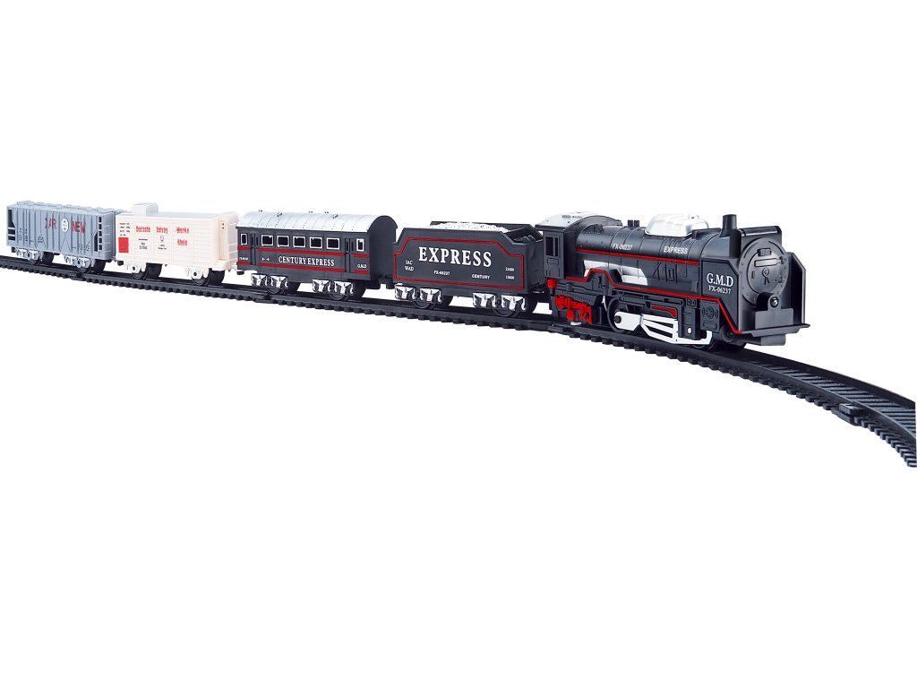 Vlak set. Délka trati 210 cm. Součástí mašinka, 4 vagóny, 4 rovné kolejnice, 10 zahnutých kolejnic. Velikost mašinky 13 cm, vagónů 10-13 cm. 2xAA baterie do mašinky nejsou součástí. Přepínač ON/OFF na pravé straně mašinky.