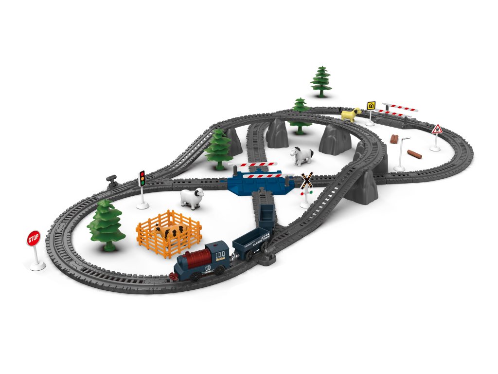 Vlak trať s efekty. Rozměry sestavené trati 112x61x7,5 cm. Vláček je propojený magnety. Trať vydává zvukové efekty. Aktivace přepínačem na mašince - směrová tlačítka pro jízdu v daném směru. Část trati aktivuje zvukové efekty, 1x3V CR2032 baterie jsou součástí. Vláček - 1xAA (1,5V), není součástí. Sada se skládá z 90 dílků.