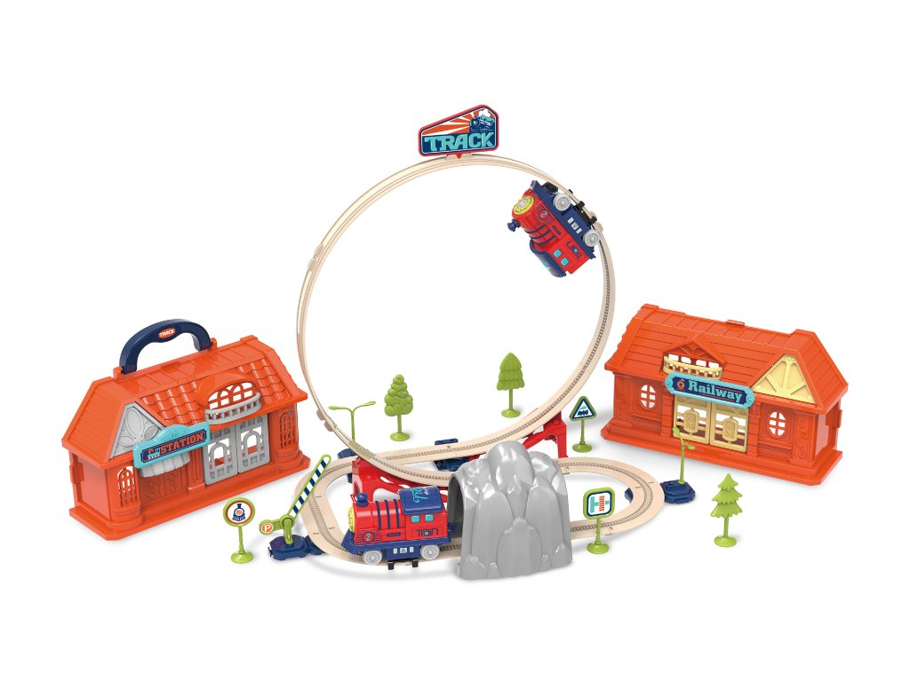 Vlaková dráha v kufříku 142 dílků. Rozměry 110x46x36,5 cm. 2xAAA baterie do mašinky nejsou součástí. Komínek mašinky slouží jako tlačítko ON/OFF. Obsah - dráha, mašinka, 2 budovy, zastávka, most, závora, značka, stromy, světla. Obrázkový návod na sestavení na vnitřní straně obalové karty.
