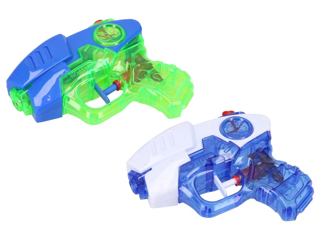 Vodní pistole. Velikost 12 cm. Display box 16 ks. 2 varianty - bílá, zelená.