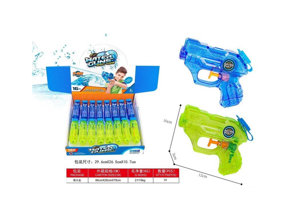 Vodní pistole. Přesné rozměry 12x10x3 cm. Display box - 16 ks. 2 varianty - modrá, zelená.