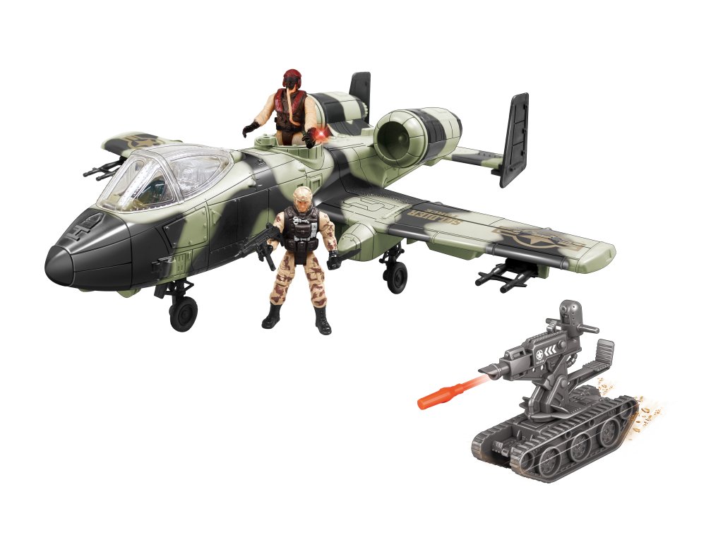 Letadlo s figurkami a efekty. Vozidlo střílející náboje a síť. Velikost letadla 48 cm, vojáků 10 cm. Světelné a zvukové efekty tlačítky na trupu před motory letadla. 2xAA baterie do letadla nejsou součástí. Obsah - letadlo, vozidlo, náboje, zbraně, 2 figurky vojáků. Obrázkový návod na používání na zadní straně obalu.