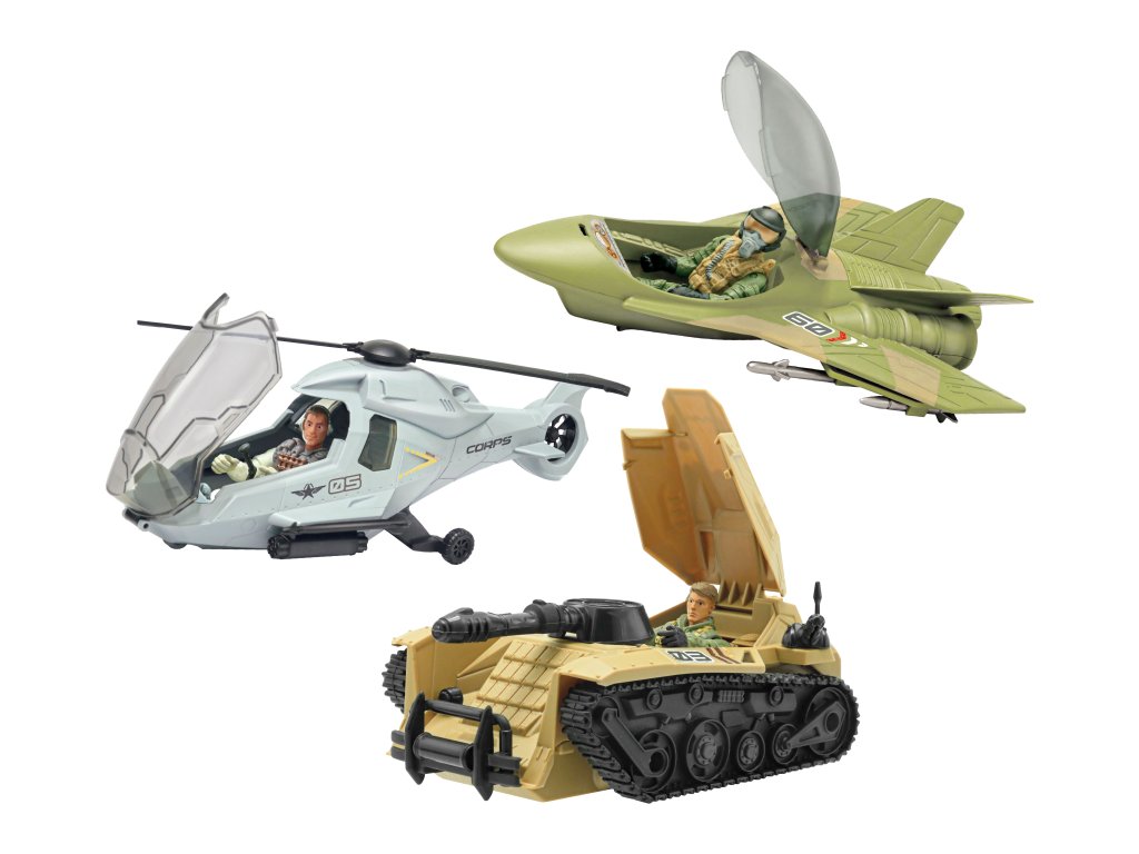 The Corps! Útočná jednotka set. Balení obsahuje 1 vojenský útočný stroj a 1 figurku vojáka. Velikost stroje 22 cm. Velikost figurky 10,5 cm. 3 varianty - tank, helikoptéra, stíhačka.