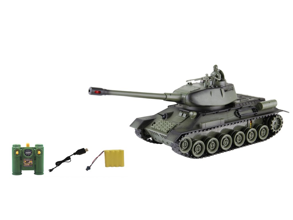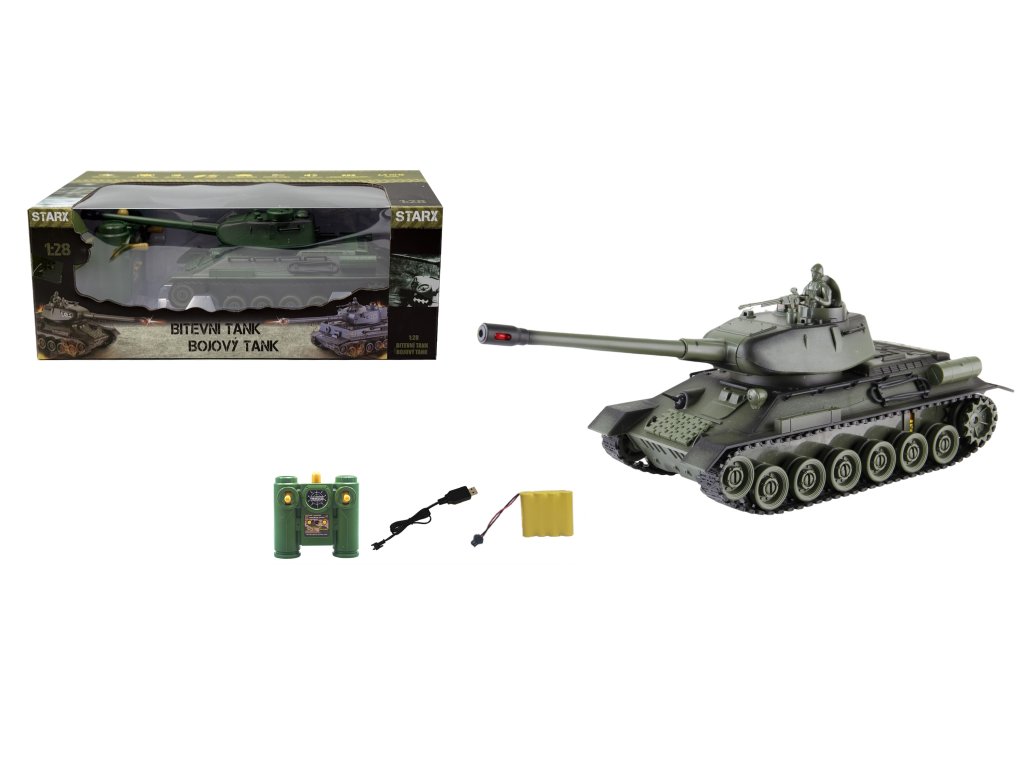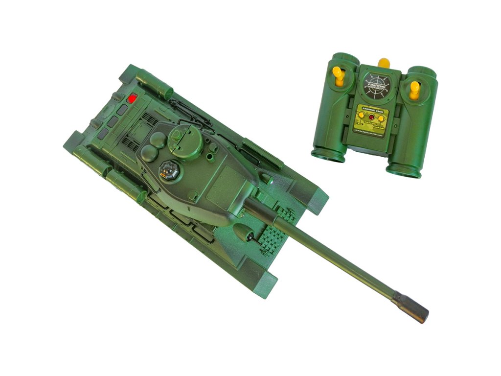 Tank s dálkovým ovladačem, infrared, 2,4 GHz. Tank aktivujete tlačítkem ON na jeho spodní straně. Tlačítkem FIRE na dálkovém ovladači spustíte zvukové a světelné efekty výstřelu. Tan jezdí všemi směry, pohyb se řídí pohybem páček na dálkovém ovladači.Pohyb tanku vpřed posun obou páček vpřed na ovladači, jízda vzad - posun obou páček dozadu. Otáčení tanku posun jedné páčky dopředu nebo dozadu. Otáčení děla tanku tlačítka ve vrchní části ovladače vlevo nebo vpravo. Provoz tanku na bateriový pack (součást balení, nabíjení přes nabíječku. Dálkový ovladač na 2x1,5V baterie AA - nejsou součást balení. V případě zakoupení 2.tanku si můžete zahrát tankovou bitvu. Každý hráč má 4 životy - světla na zadní části tanku. Po každém zásahu jedno světlo zhasne. Prohrává ten, komu se nejdříve rozblikají světla na zadní části tanku