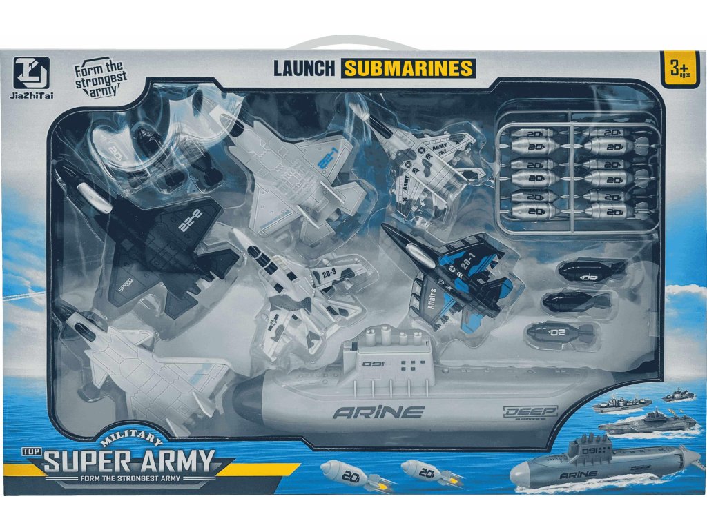 Sada letounů a ponorky.