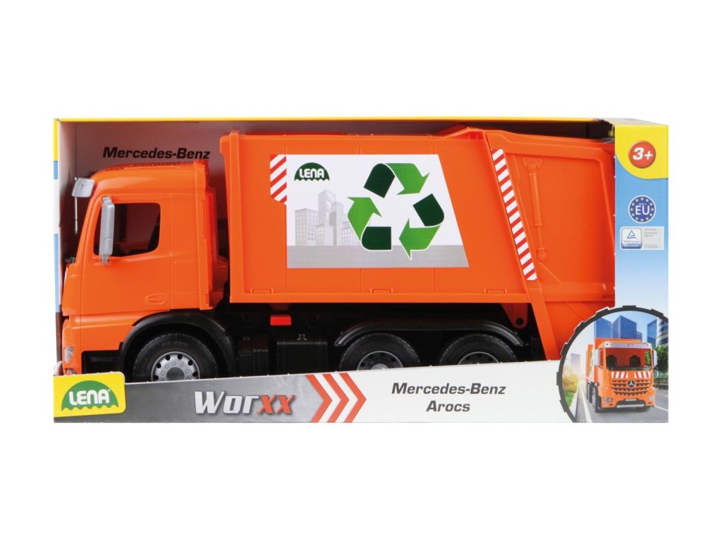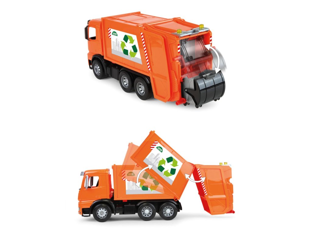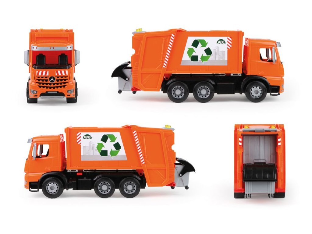 Mercedes Arocs popelář. 6mm tlusté kovové osky u kol. Součástí je pojistka proti nežádoucímu vyklopení. 1x malá + 1x velké popelnice. Vyrobeno v ČR