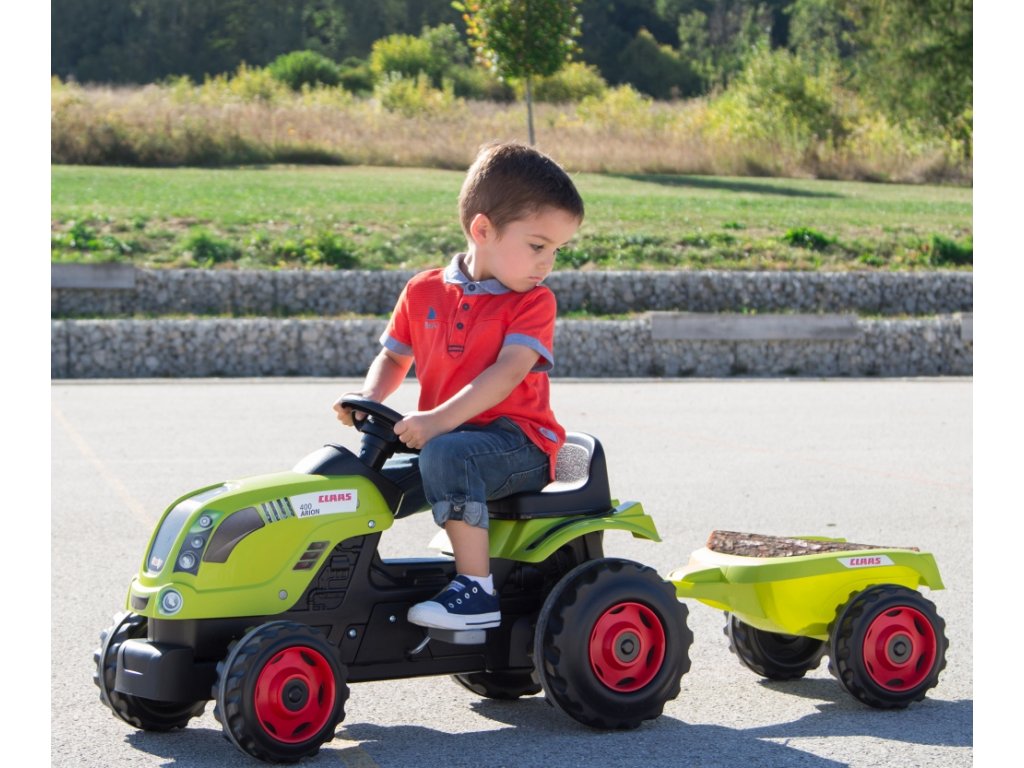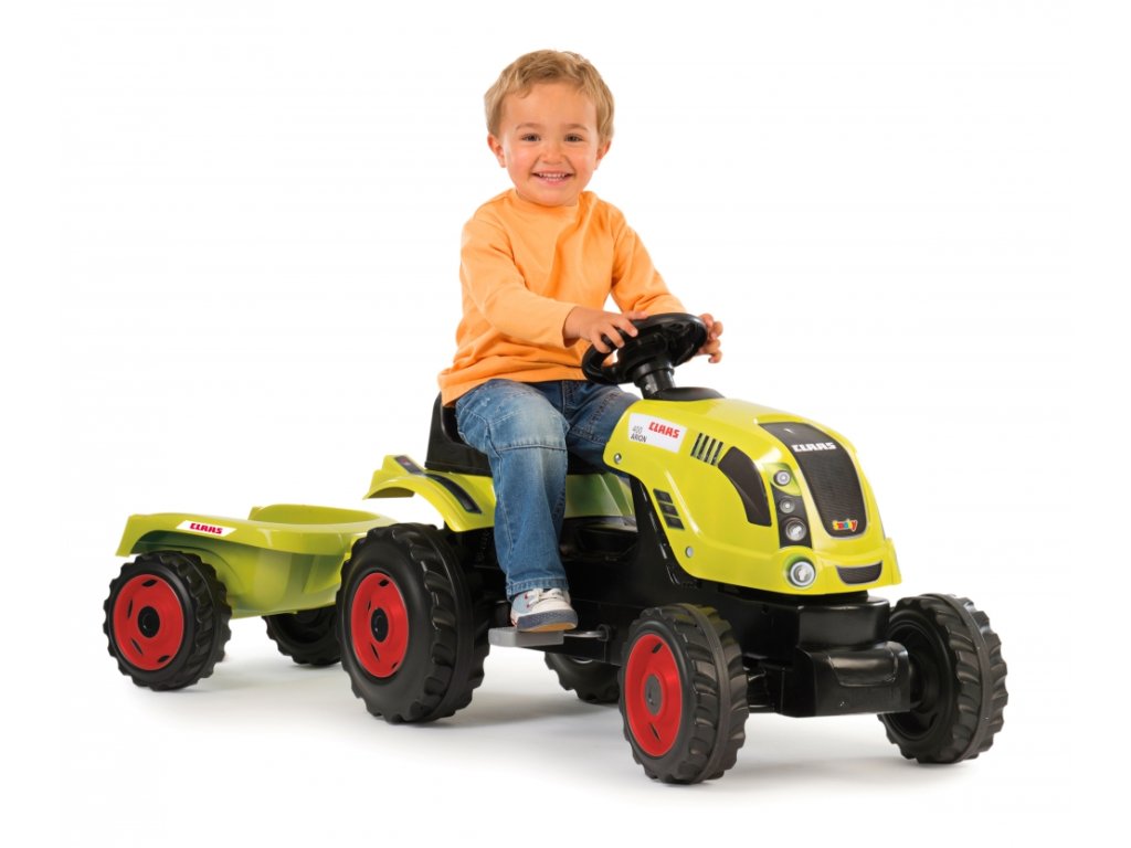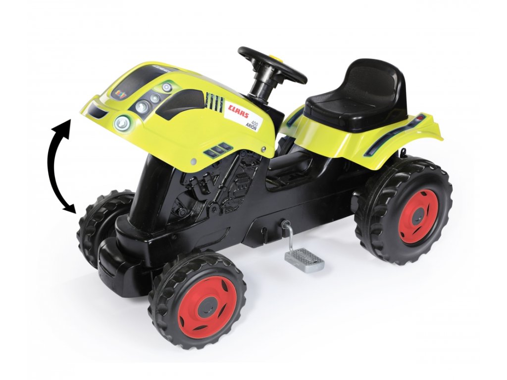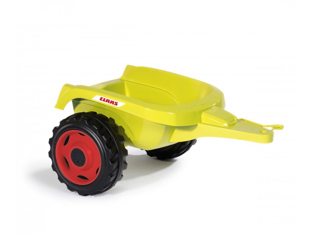 Šlapací traktor CLAAS s volantem a přívěsným vozíkem, který lze odpojit. Odklápěcí kryt motoru. Nastavitelné sedadlo dle výšky dítěte. Klakson na volantu. Vyrobeno z velmi kvalitního plastu. Rozměry vč. vozíku: 142 x 54,5 x 44 cm. Délka traktoru bez vozíku cca 80 cm. Hmotnost 6,3 kg.