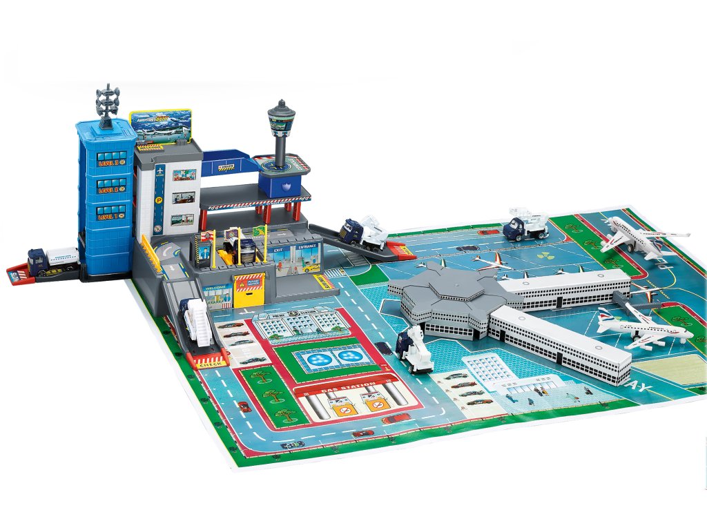 Garáž letiště set 4 auta a letadlo. Rozměry hrací plochy 87x60x30 cm. Obsahuje 4 kovová autíčka 7 cm (volná kola), a 1 kovové letadlo 13x13 cm.