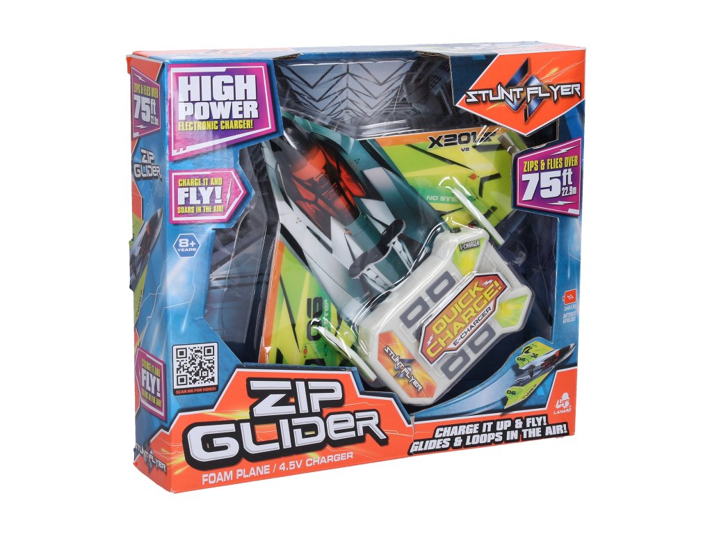 Letadlo házecí elektrické Zip Glider. Rozpětí křídel 23cm. Dolet až 22,9 m. Letadlo je rychlodobíjecí. Návod na nabíjení na zadní straně obalu. Připojte letadlo na nabíječku, přes nabíjecí port na spodní straně. Podržte tlačítko na nabíječce na 30 vteřin. Odpojte z nabíječky a můžete létat. 4,5V nabíječka. Letadlo je pěnové. Baterie 3xAA/LR6 (1,5V), nejsou součástí balení.