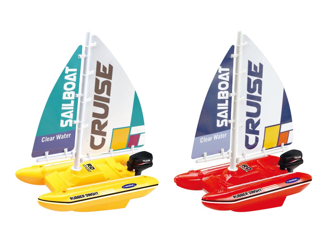 Loď katamarán. Rozměry 19x9,5x25 cm. 2xAA baterie nejsou součástí. Přepínač ON/OFF v zadní části lodi před motorem. 2 barevné varianty - žlutá, červená.