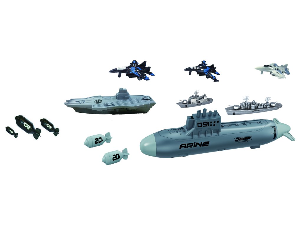 Ponorka s odpalovačem torpéd 28 cm set. Obsah balení - ponorka s vystřelováním torpéd 28 cm na setrvačník, letadlová loď 18 cm, bitevní loď 16 cm, bitevní křižník 14 cm, 3x stíhačka volná kola 9 cm, 9x torpédo do ponorky. Torpédo - odklopte dvířka v horní části ponorky - vložte torpédo (max 3), sejměte přední krytku ponorky, natažením a puštěním ocasního kormidla ponorky vystřelíte torpédo. Obrázkový návod na obalu.
