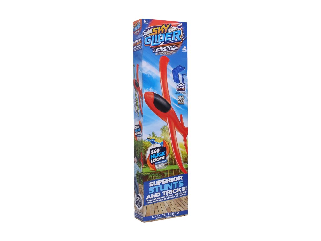 Sky Glider Letadlo házecí. Rozpětí křídel 48 cm. Lze upravit ocasní plochy, pro let vpřed nebo ve smyčce. Může letět až 30m. 2 varianty - modrá, červená. Návod na používání na zadní straně obalu.