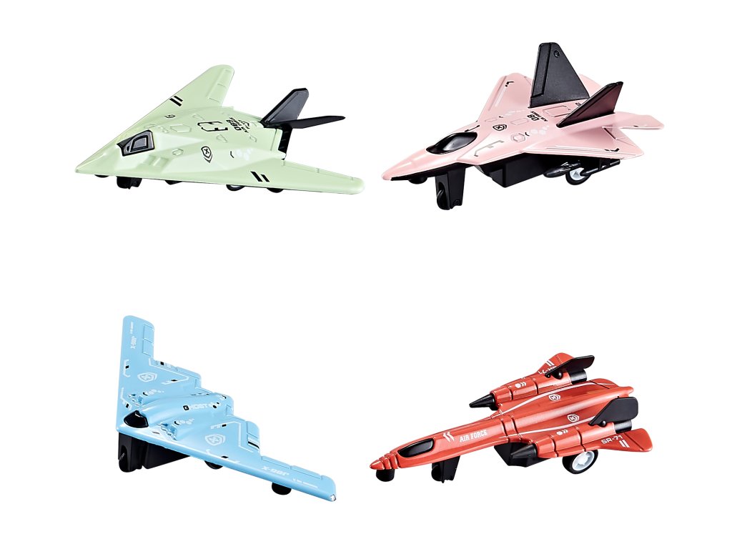 Stíhačka kovová. Rozměry 11,5x8x2,5 cm. Na zpětné natažení. 12 ks display box. 4 varianty - modrá, zelená, růžová, červená.