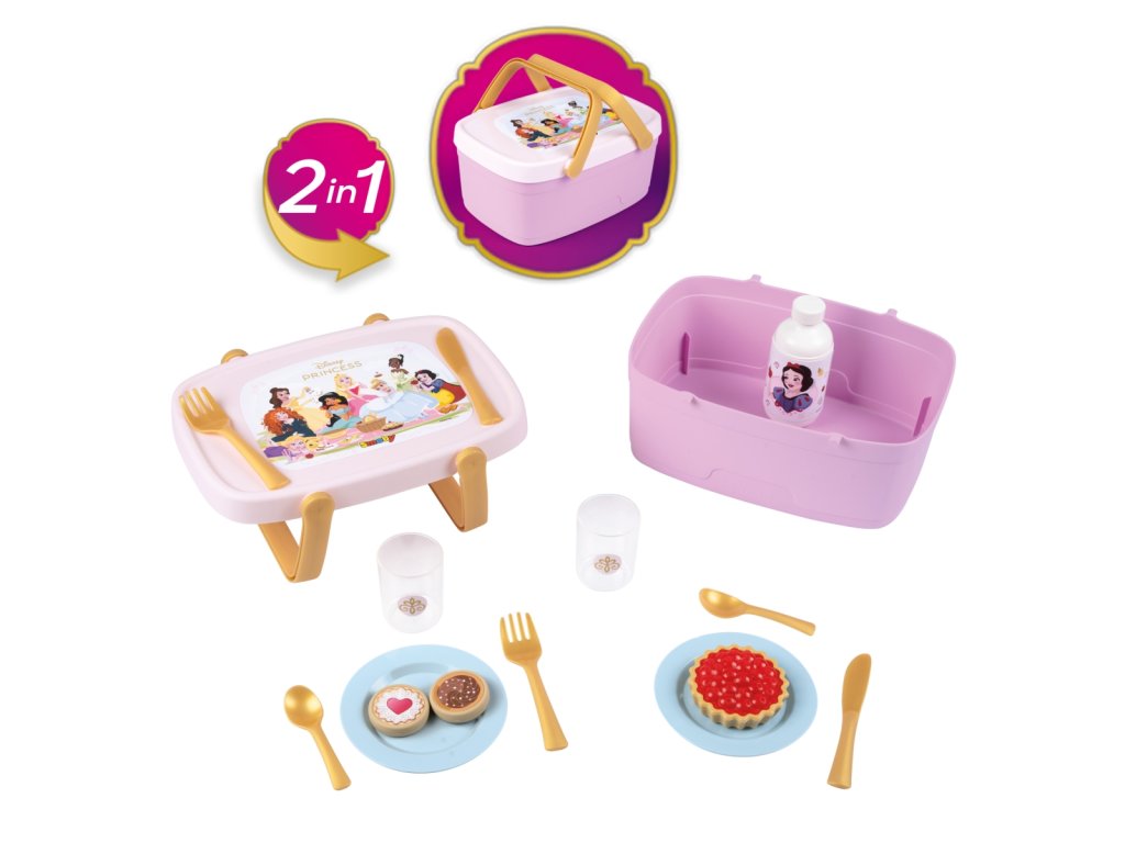 Piknikový koš 2 v 1 s motivem Disney Princess lze snadno přeměnit na stoleček - sklopením rukojetí u víka. Součástí je 14 ks příslušenství: 2 talříe, 2 lžíce, 2 nože, 2 vidličky, 2 sklenice, malinový koláč, 2 sušenky a láhev limonády. Rozměry (DxŠxV): 25,5 x 18 x 11 cm.