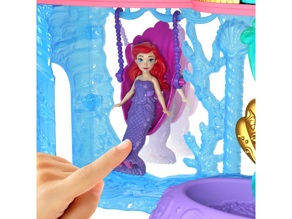 Herní set Malá panenka Ariel a královský zámek obsahuje herní plochy pro hru na souši i v moři a malou panenku Ariel s ocasem, který mění barvu! Dvoupatrový zámek nabízí patro s funkcí stříkající vody, který představuje podmořský život mořské víly a patro s pohyblivým tanečním parketem představující Arielin život na souši. Nechybí ani její věrný kamarád Flounder a více než 10 pohádkových herních dílků pro kompletní hru na mořskou pannu a princeznu. Barvy a vzhled výrobku se mohou lišit.