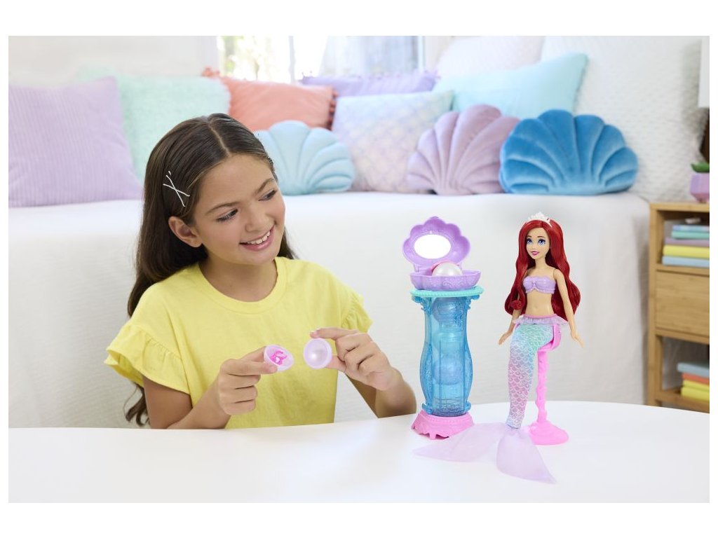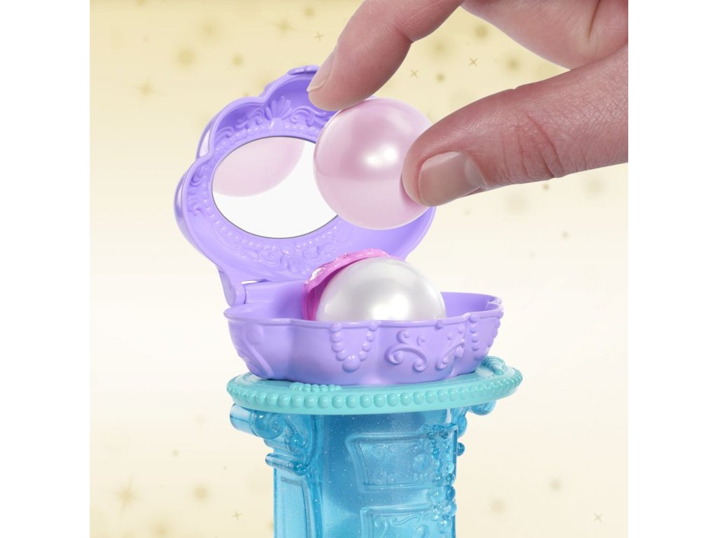 Herní set panenka Ariel s toaletním stolkem je připravena na dobrodružství se skrytými překvapeními a opakovatelnou hrou! Otevřete stolek a vynoří se perla s překvapivým doplňkem - celkem je jich 5! Perly lze do toaletního stolku znovu vložit a hrát si s nimi donekonečna. Set obsahuje módní panenku Ariel s odnímatelným ocasem z měkkého materiálu v novém třpytivém vzhledu.