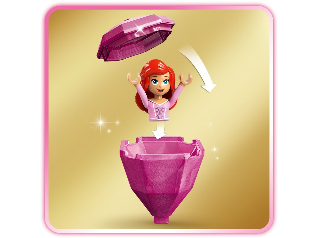 Okouzlete děti a fanoušky filmu Malá mořská víla od studia Disney od 5 let stavebnicí LEGO® | Disney Princess (43259) Točící se Ariel. Stavebnice obsahuje sestavitelný stojan pro fantasy hračku s otočnou podložkou, klíč, vidličku, prostor pro Šupinku a „diamant“ po stranách. Děti mohou Ariel umístit do „diamantových“ šatů s deštníkem jako víkem, aby byla v bezpečí. Tento sestavitelný Disney model představuje zábavný dárek pro holky, kluky a filmové fanoušky, skvěle se vyjímá na výstavce a je ideální na krátké a zábavné každodenní hraní. S touto stavebnicí si děti užijí spoustu zábavy a při skládání zapojí kreativitu. Model jim pomůže zvýšit sebevědomí a podnítí jejich představivost při vymýšlení příběhů. Děti se s modelem můžou hrát samostatně nebo ho přidat k dalším stavebnicím LEGO | Disney (prodávají se samostatně) z této řady. Děti se můžou těšit na nenáročné a intuitivní stavitelské dobrodružství s aplikací LEGO Builder. V ní si lze přibližovat a otáčet modely ve 3D, ukládat stavebnice a sledovat postup stavění.
