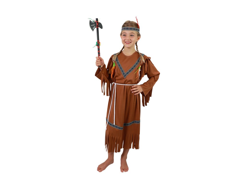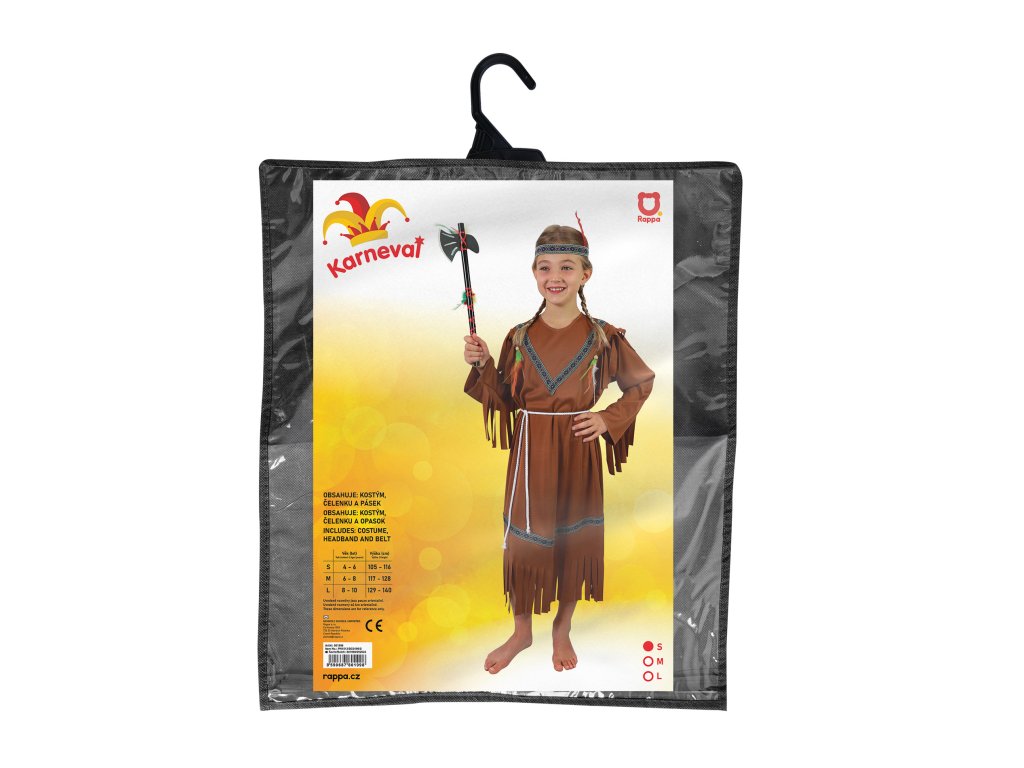 Stylový karnevalový kostým v motivu indiánské slečny! Kostým hnědé barvy ve velikosti S je určen pro děvčata ve věkovém rozmezí 4-6 let (110-116 cm). Balení obsahuje šaty s indiánskými vzory, šňůrku sloužící jako opasek a perfektně sladěnou čelenku. Celé šaty jsou navíc zdobeny střapci.