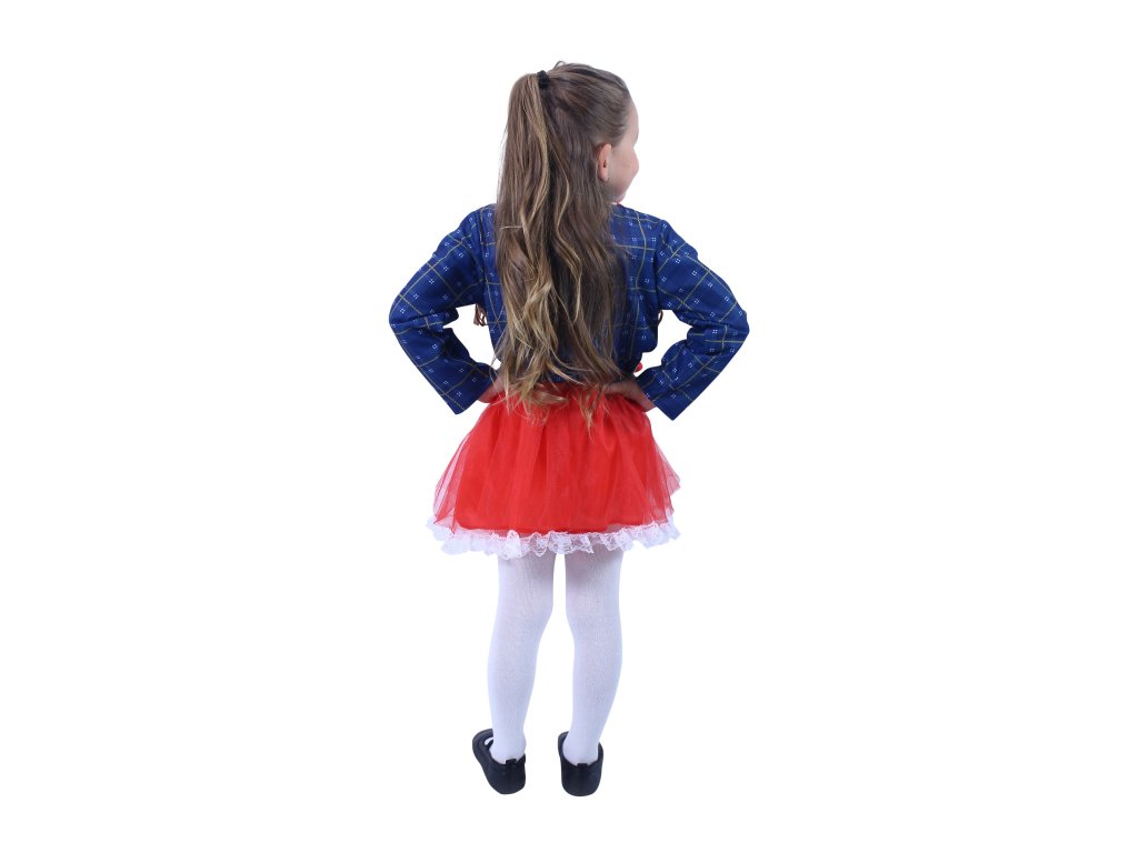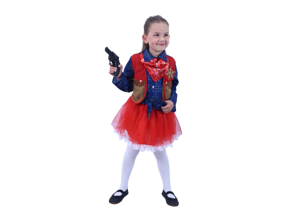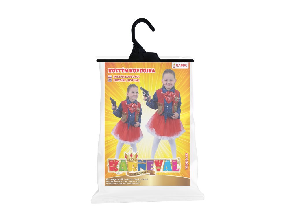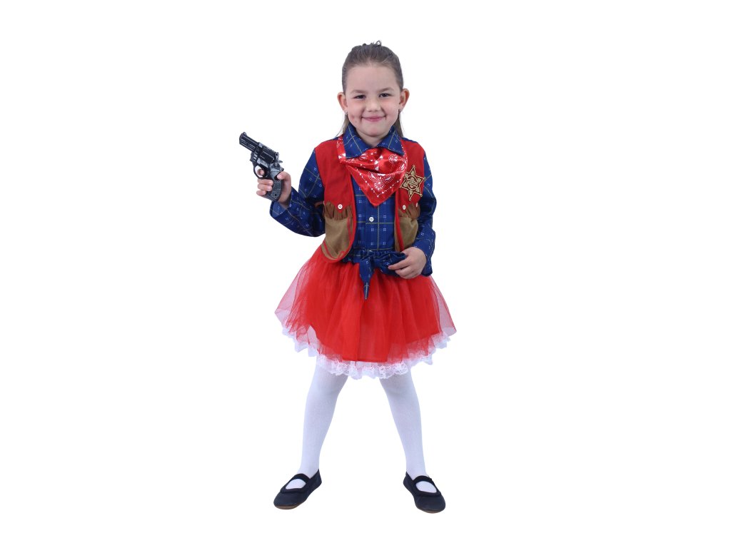 Senzační karnevalový kostým pro malé kovbojky! Kostým ve velikosti S je určen pro děvčata ve věkovém rozmezí 4-6 let (105-116 cm). Balení obsahuje nadýchanou červenou sukni, modrou košili s límečkem, vestu a šátek.